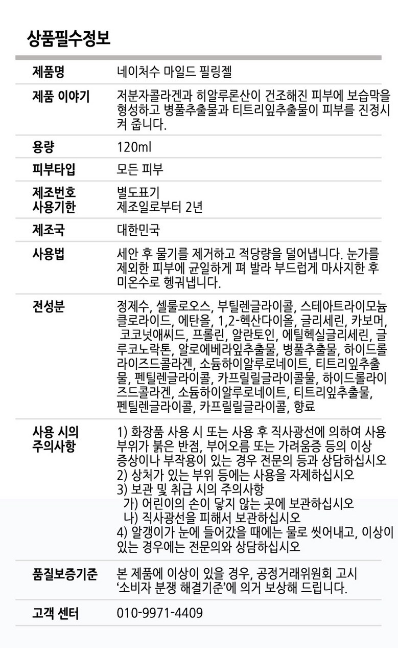 | 품명 및 모델명 | 네이처수 저자극 마일드 필링젤 120ml | 인증/허가 사항 | 상품 상세페이지 참조 |
