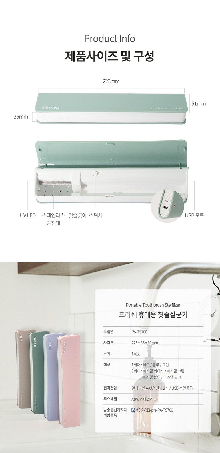 | 품명 및 모델명 | 휴대용 칫솔살균기 / PA-TS700 | KC 인증정보 | MSIP-REI-prs-PA-TS700 |
