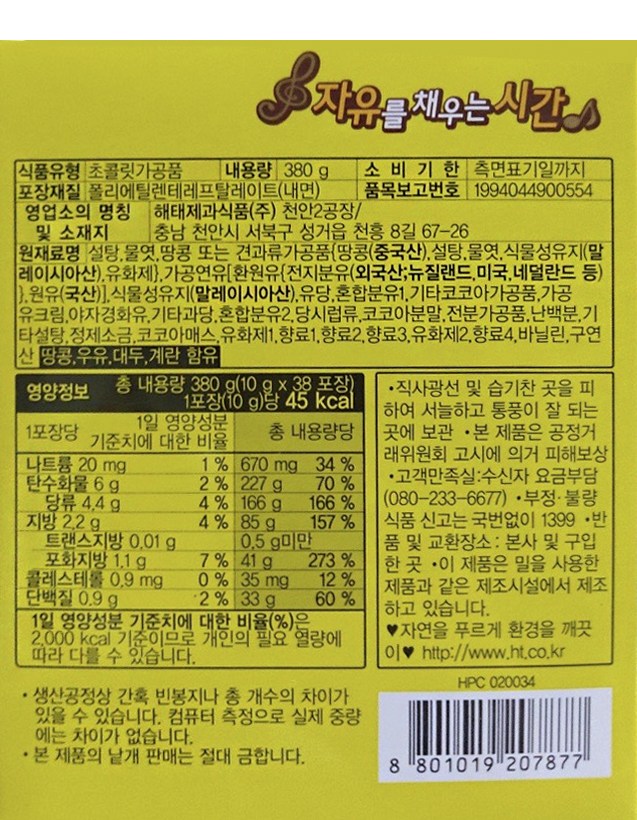 | 생산자 및 소재지 | 해태제과식품(주) / 충청남도 천안시 서북구 성거읍 천흥리 321-4 | 제조연월일, 소비기한 또는 품질유지기한 | 소비기한(또는 유통기한) : 2026년 01월 27일 이거나 그 이후인 상품<br />제조년월일 : 2025년 03월 04일 이후인 제조상품 |