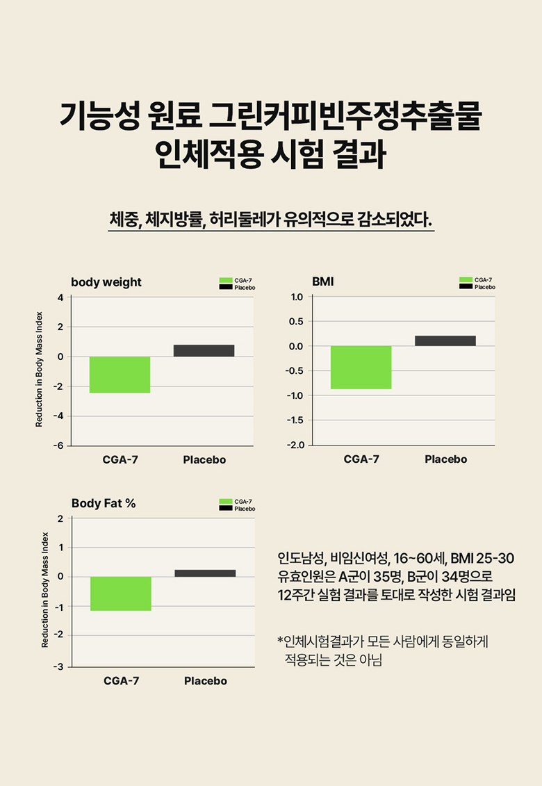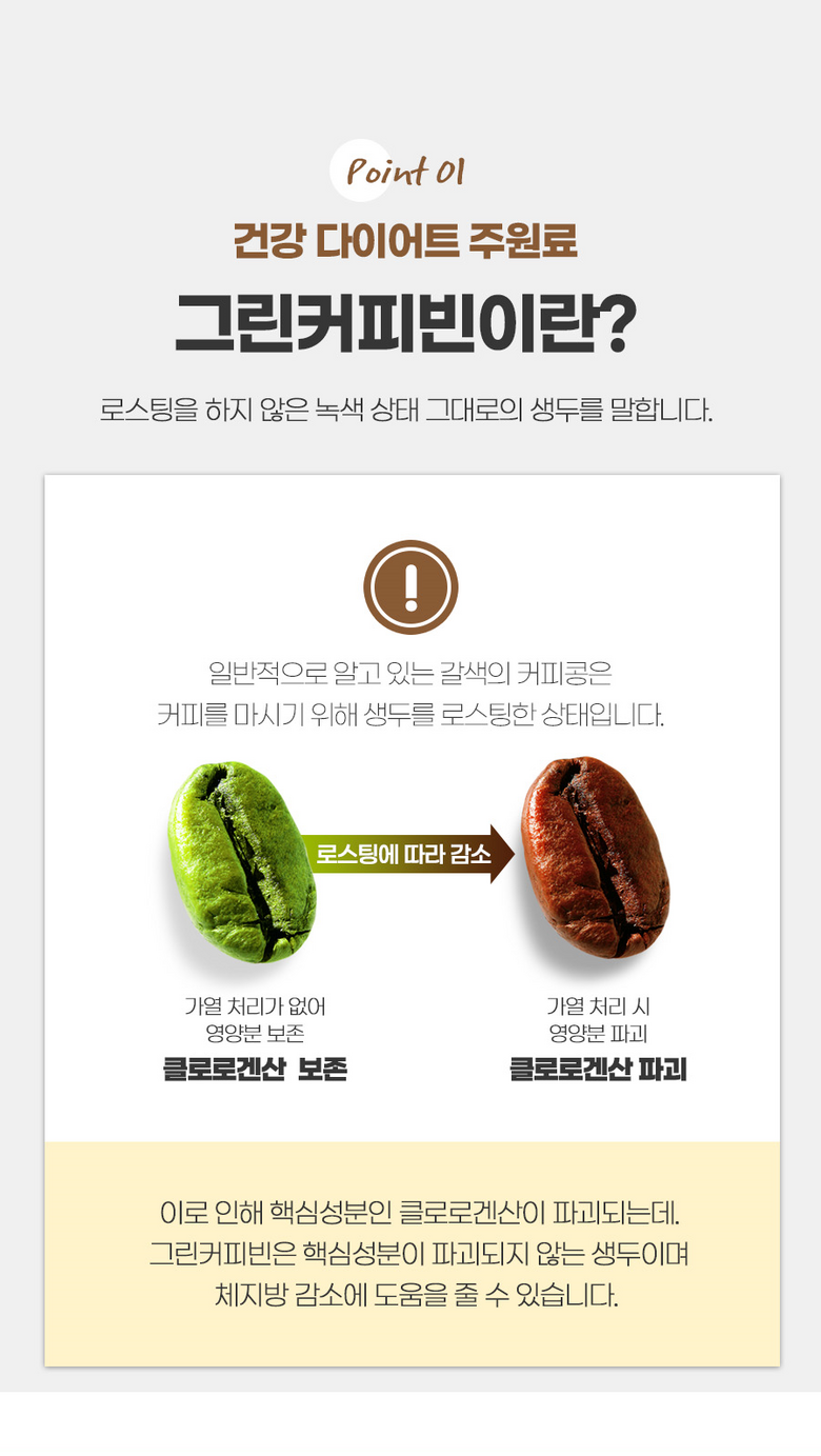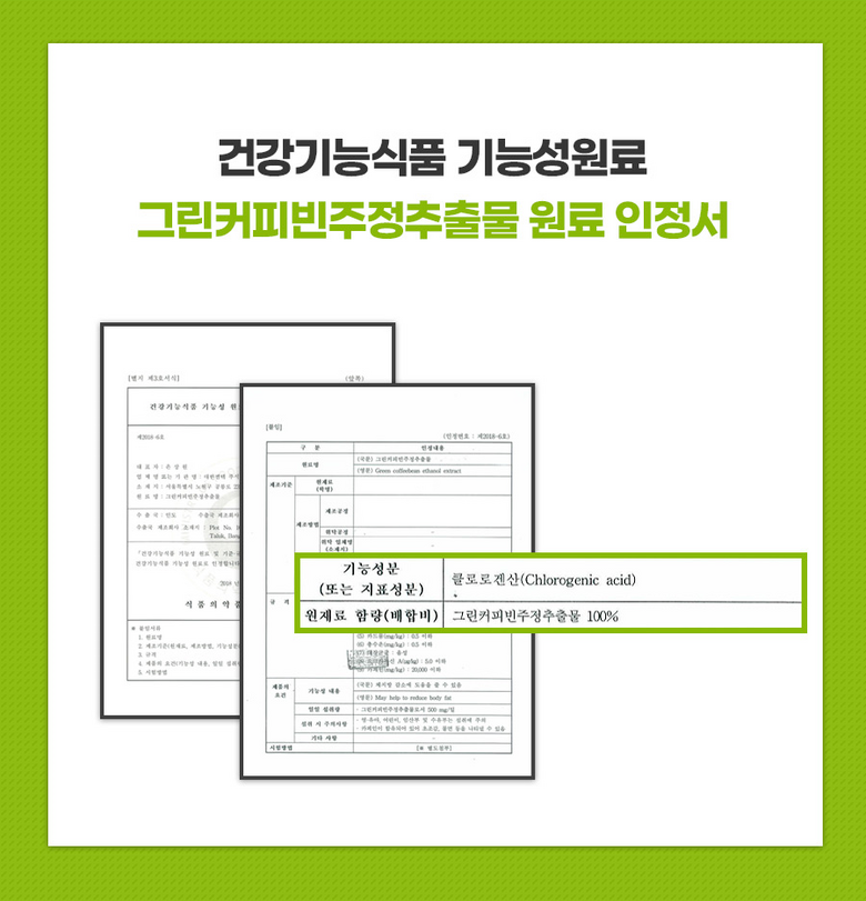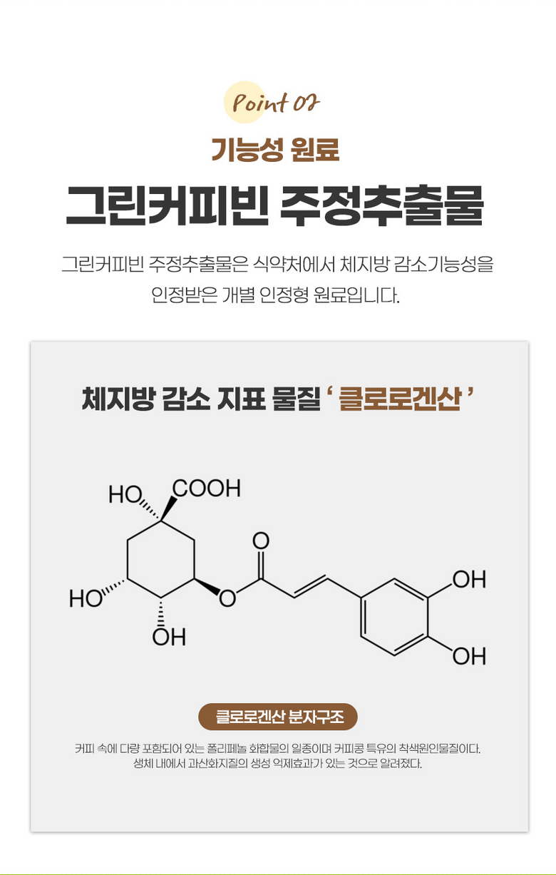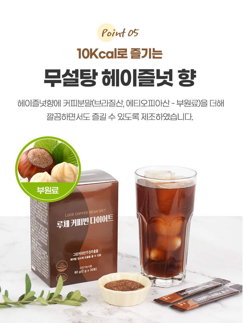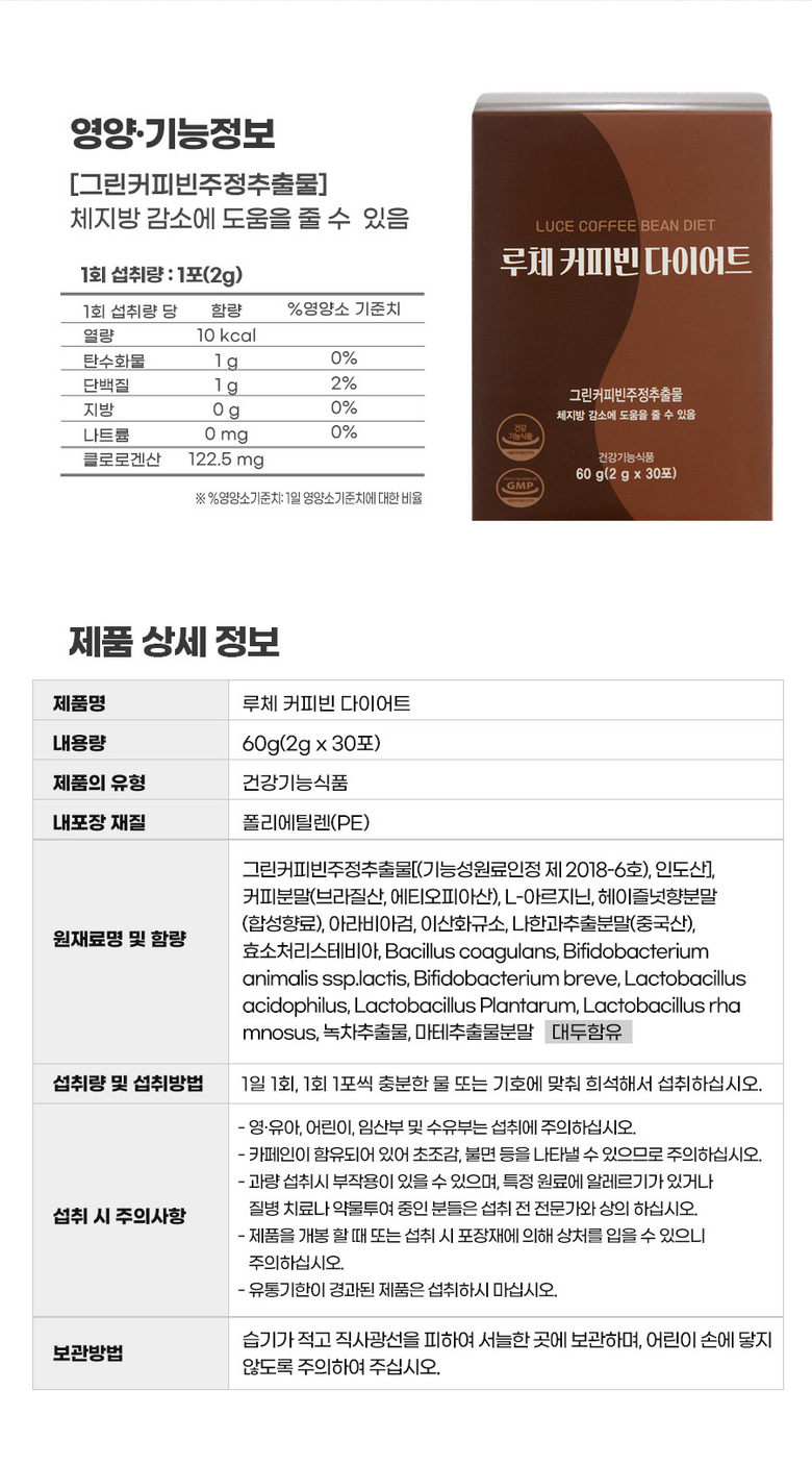 | 원료명 및 함량 | 그린커피빈주정추출물(기능성원료인정 제2018-6호) 인도산, 커피분말(브라질산, 에티오피아산), L-아르지닌, 헤이즐넛향분말, 아리비아검, 이산화규소, 나한과추출분말, 효소처리스테비아 | 영양정보 | 열량 10kcal, 탄수화물 1g, 단백질 1g, 지방 0g, 나트륨 0g, 클로로겐산 122.5mg |