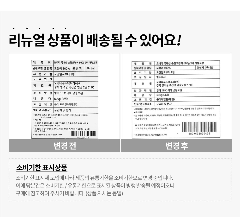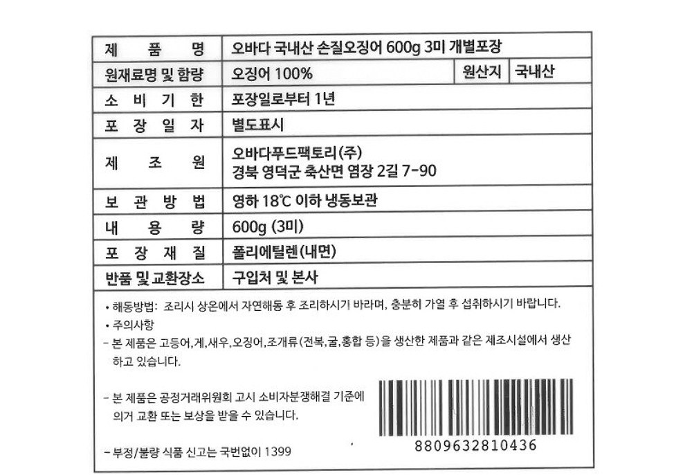 | 품목 또는 명칭 | 오바다 국내산 손질오징어 600g 3미 개별포장 | 포장단위별 내용물의 용량(중량),수량,크기 | 600g(3미), 1개 |