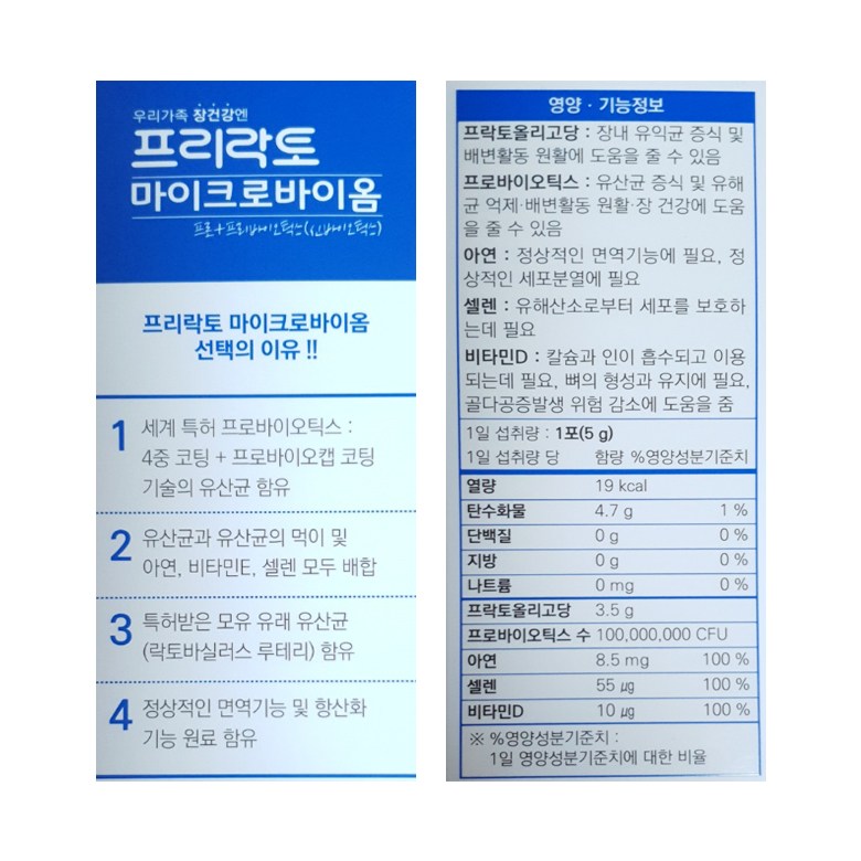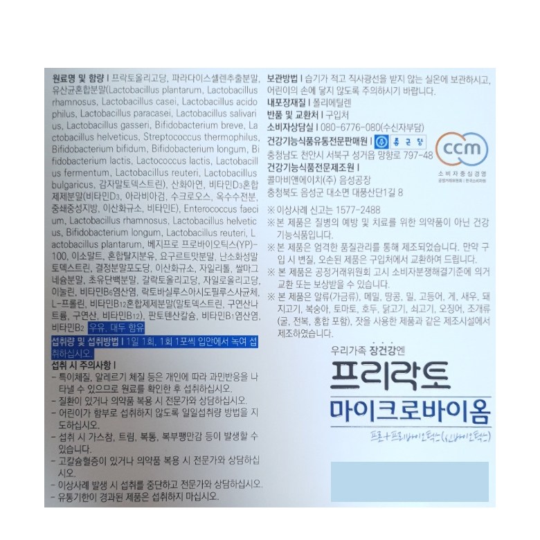 | 제품명 | 프리락토 마이크로바이옴 | 제조업소의 명칭과 소재지 | 콜마비앤에이치(주) |