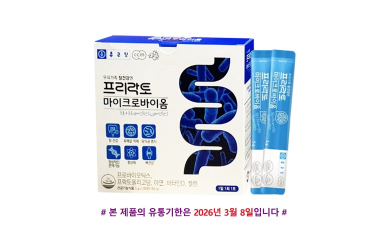 | 소비기한 및 보관방법 | 2026년 3월 8일까지 | 포장단위별 내용물의 용량(중량), 수량 | (5g x 30포) x 1박스 |