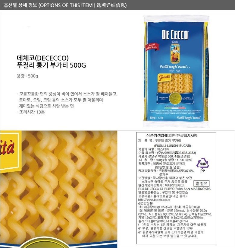 | 생산자 및 소재지 | F.LLI DE CECCO FARA SAN MARTINO S.P.A / 이태리 / ㈜보라티알 | 제조연월일, 소비기한 또는 품질유지기한 | 소비기한(또는 유통기한) : 2026년 12월 31일 이거나 그 이후인 상품<br />제조년월일 : 2024년 01월 02일 이후인 제조상품 |
