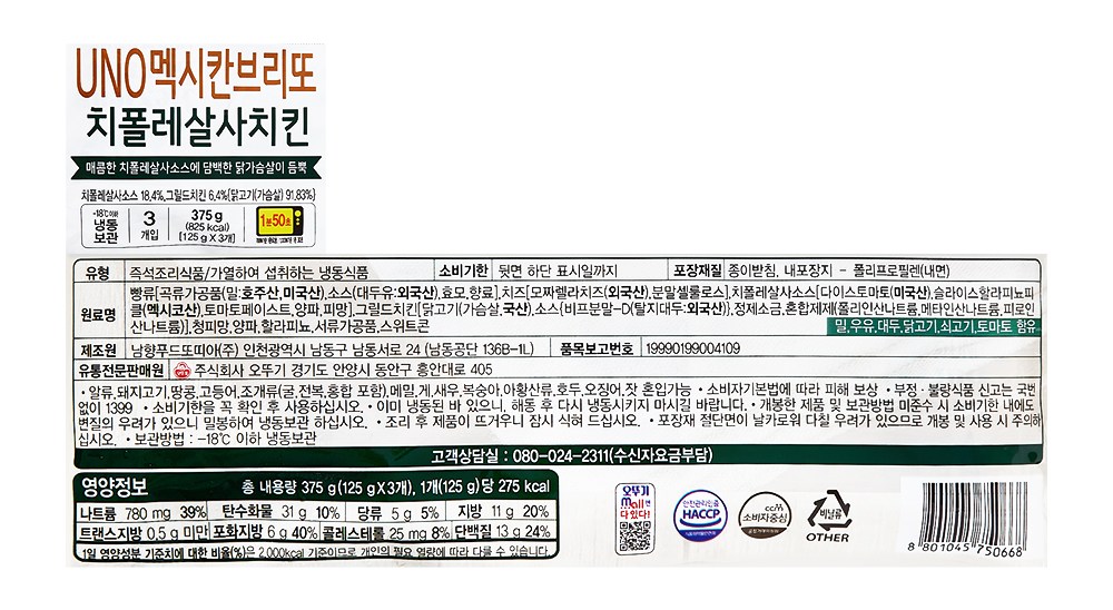| 제품명 | UNO멕시칸브리또 치폴레살사치킨 | 식품의 유형 | 컨텐츠 참조 |