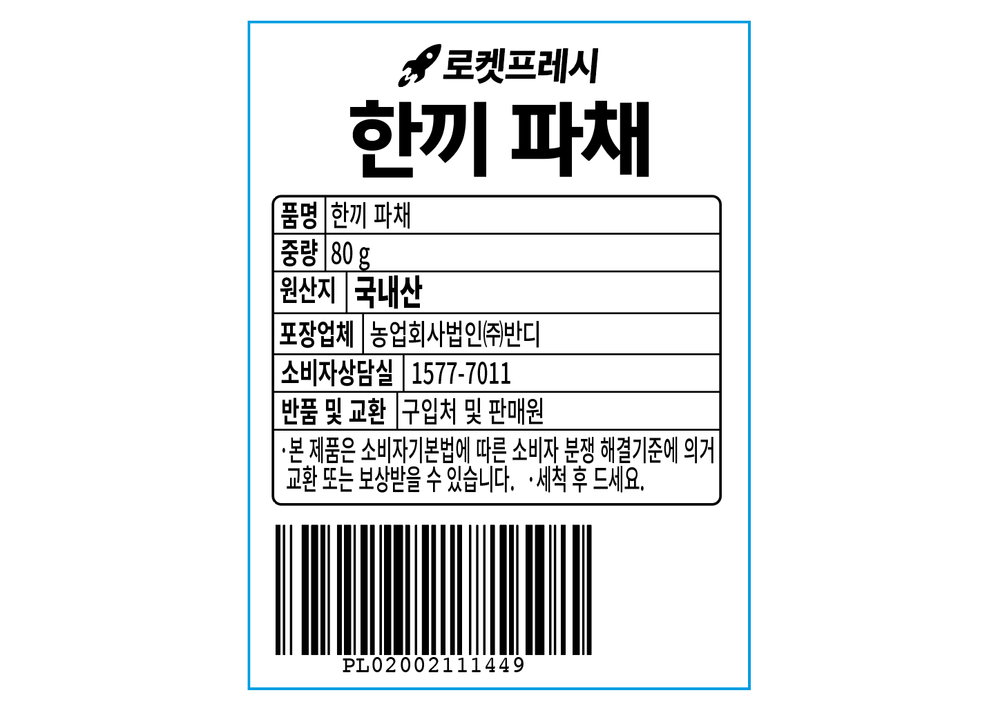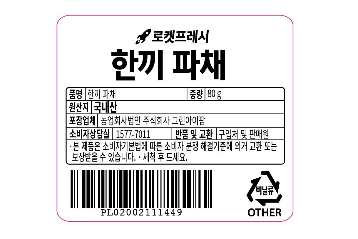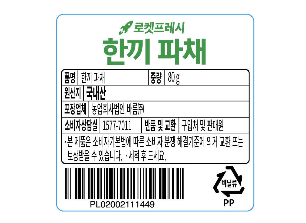 | 품목 또는 명칭 | 한끼 파채 | 포장단위별 내용물의 용량(중량),수량,크기 | 80gx2개 |