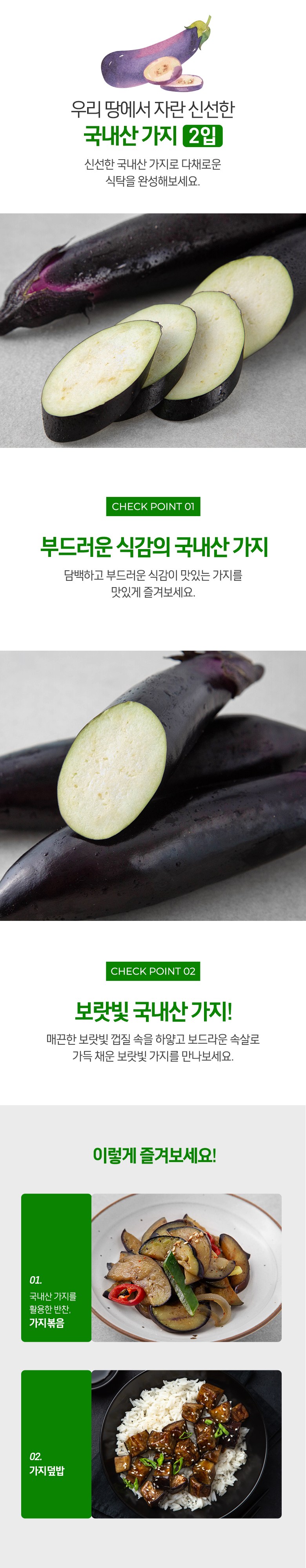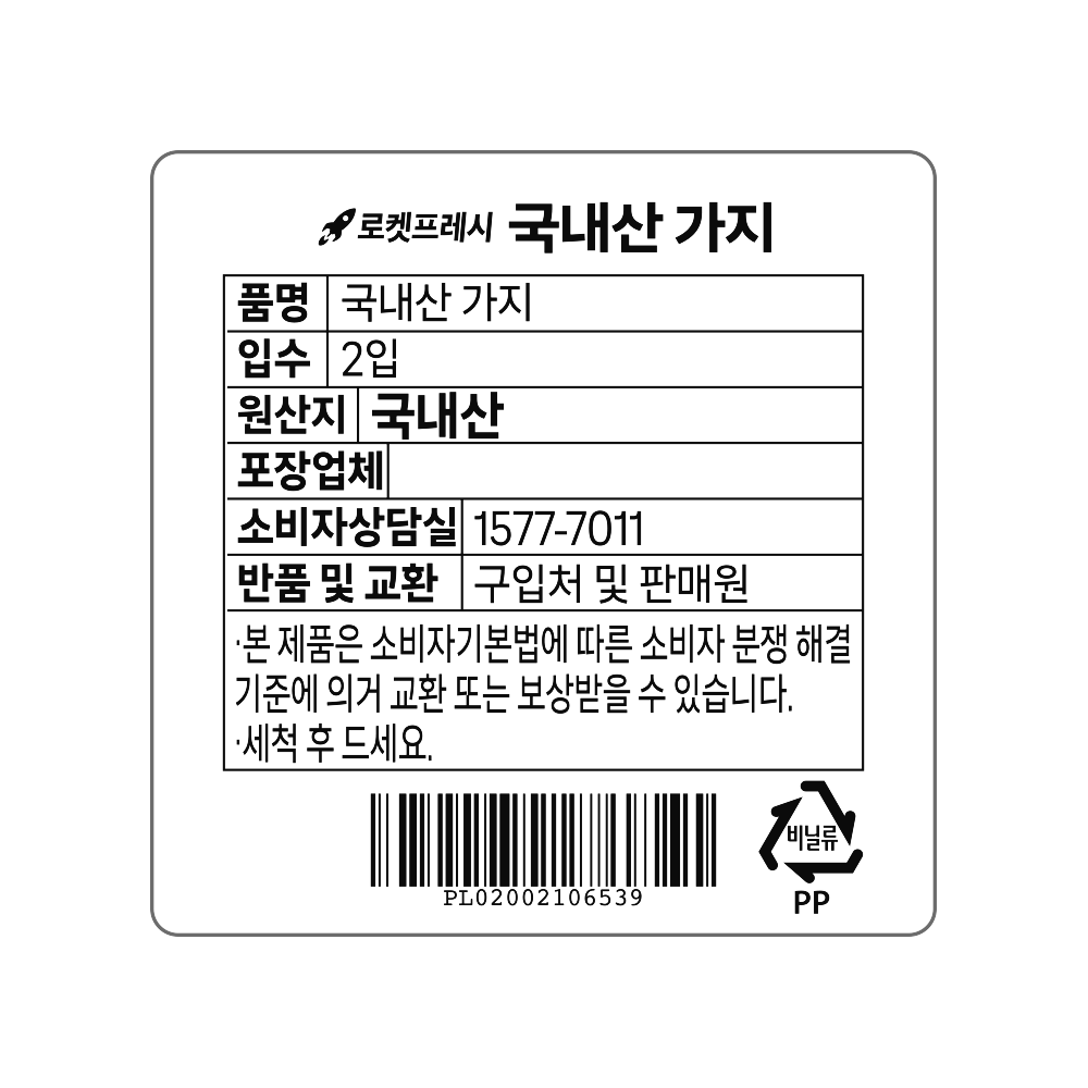 | 품목 또는 명칭 | 국내산 가지 | 포장단위별 내용물의 용량(중량),수량,크기 | 2개입(200g)x3개 |