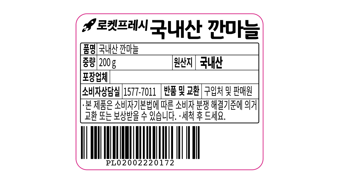 | 품목 또는 명칭 | 깐마늘 | 포장단위별 내용물의 용량(중량),수량,크기 | 200gx2개 |