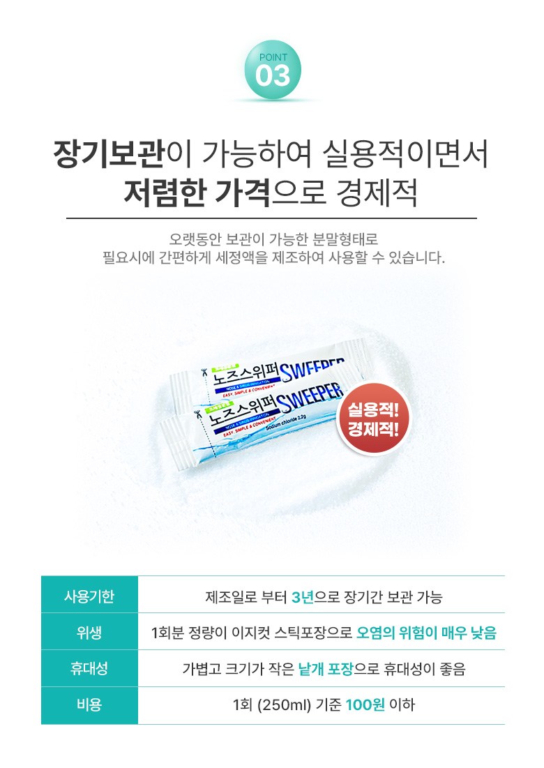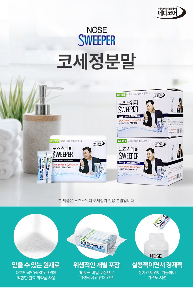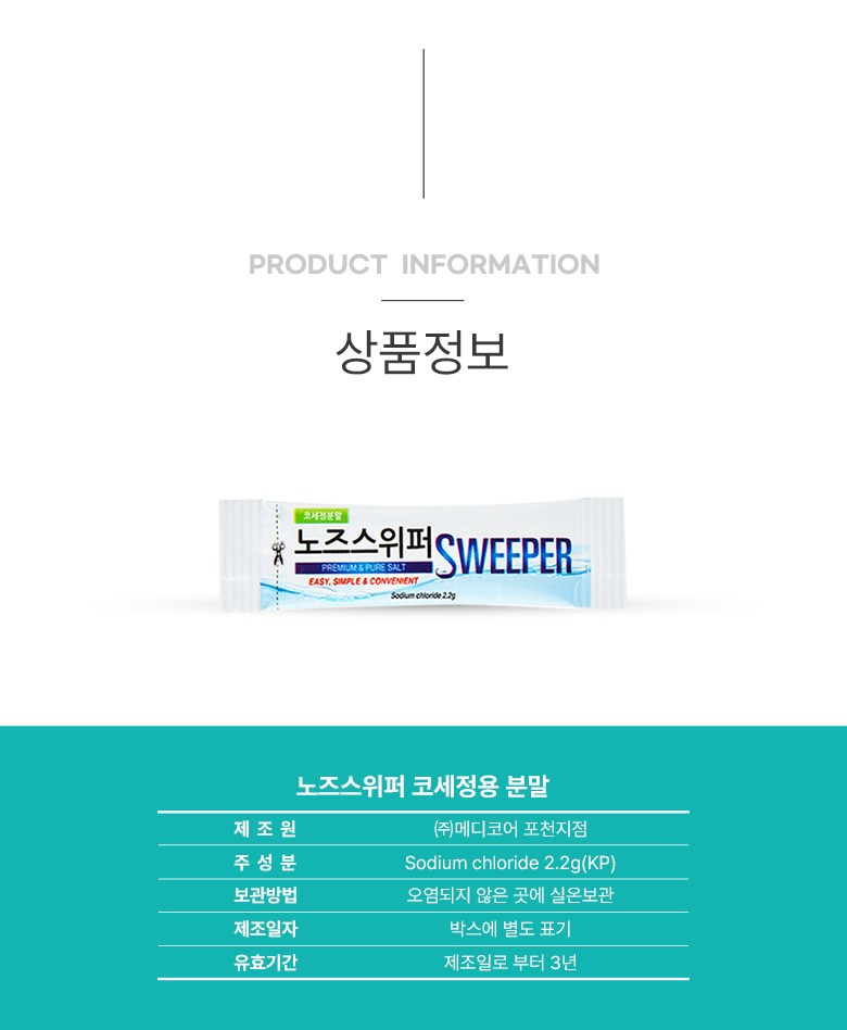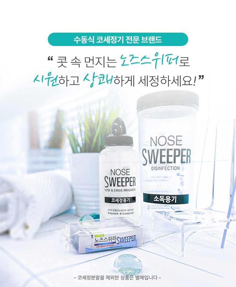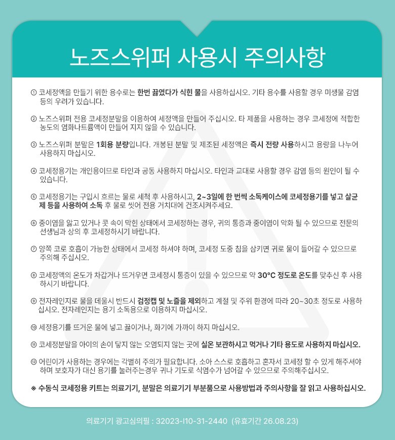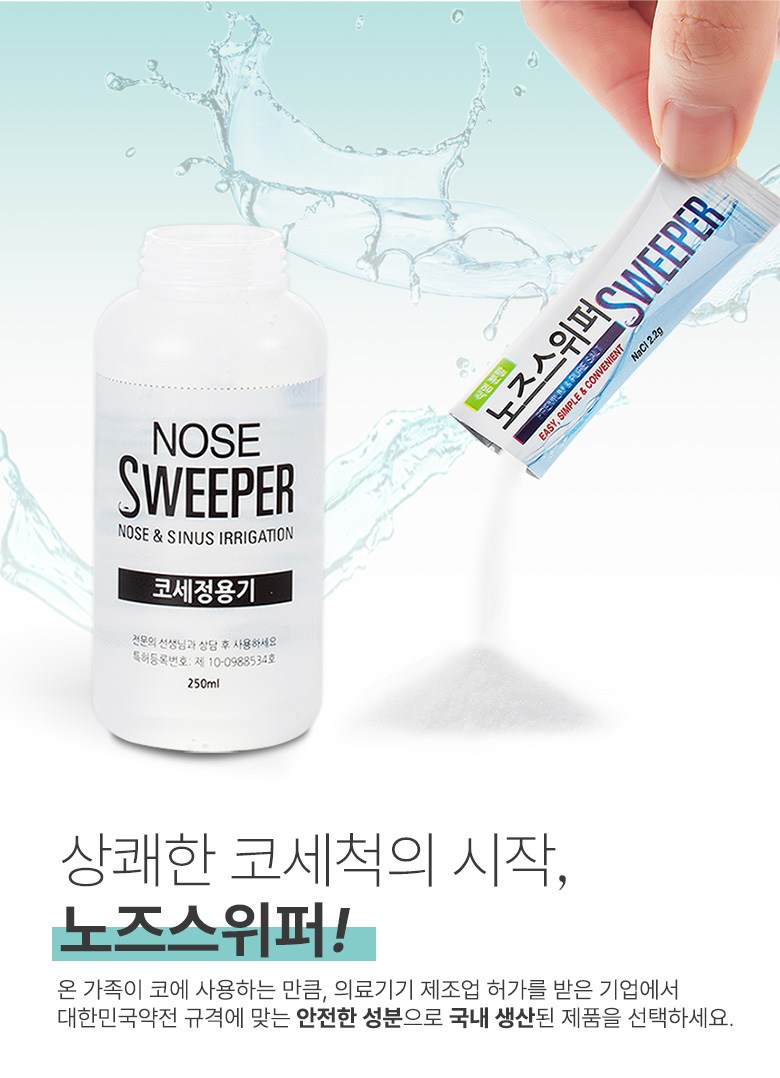 | 품명 및 모델명 | 수동식코세정용키트 / 노즈스위퍼 | 허가∙인증∙신고번호 (의료기기법에 따른 허가∙인증∙신고 대상 의료기기에 한함) | 품목허가번호 : 제신 18-564 호 |