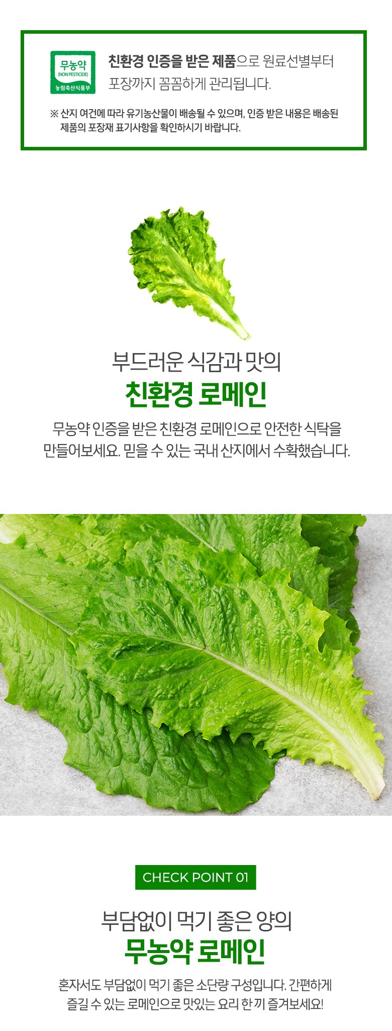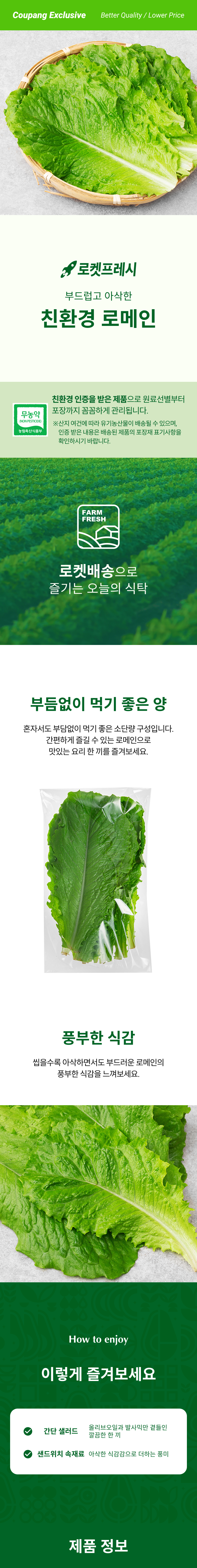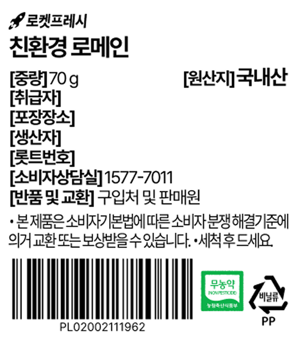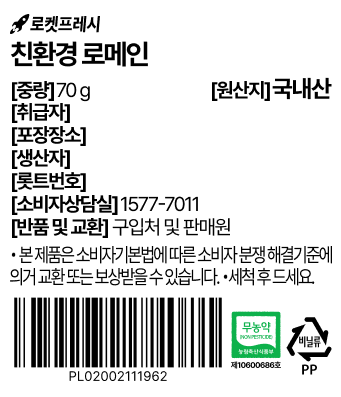 | 품목 또는 명칭 | 친환경 로메인 | 포장단위별 내용물의 용량(중량),수량,크기 | 70gx2개 |