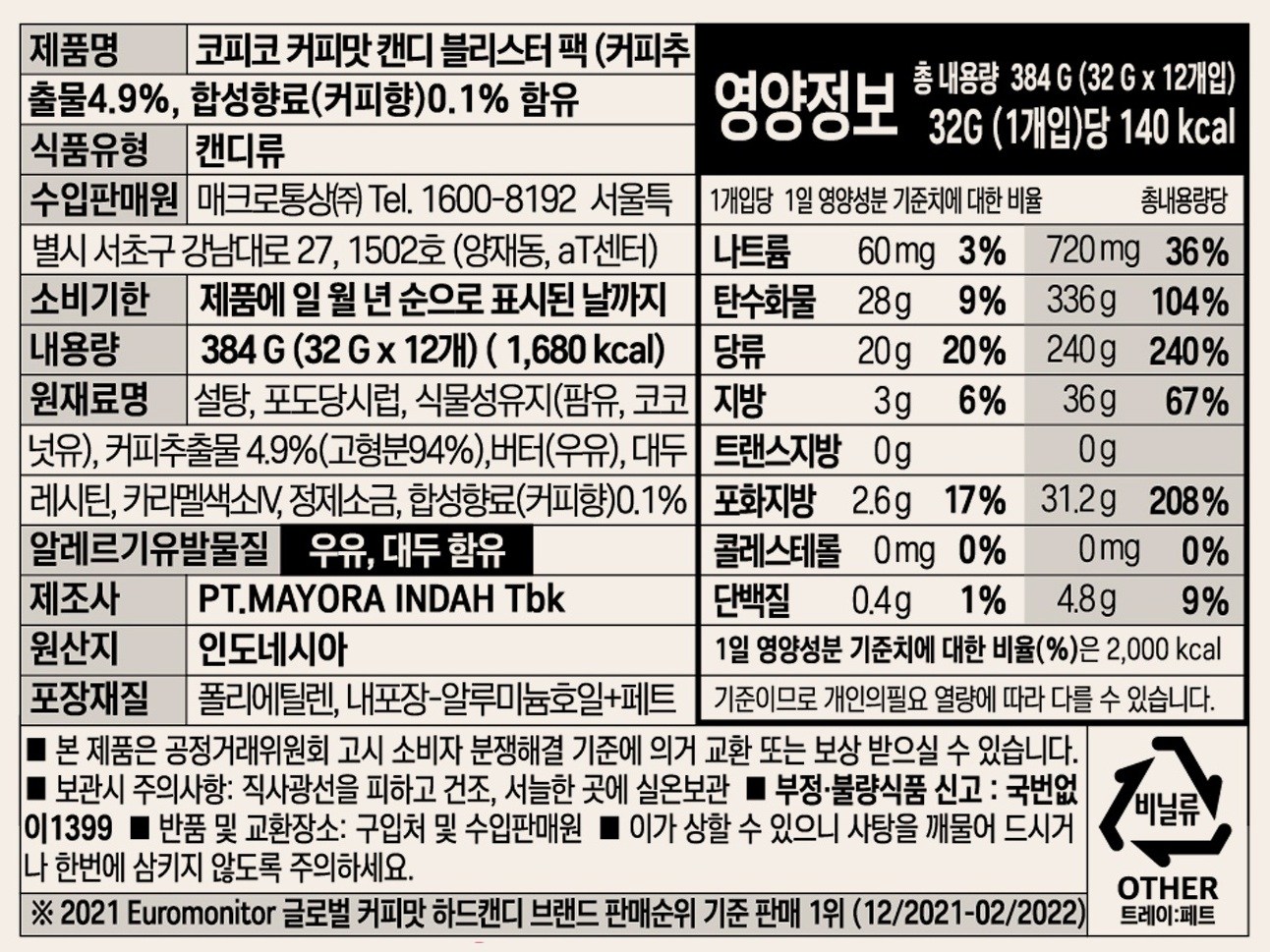 | 포장단위별 내용물의 용량(중량), 수량 | 384g x 2개 | 원재료명 및 함량 | 컨텐츠 참조 |