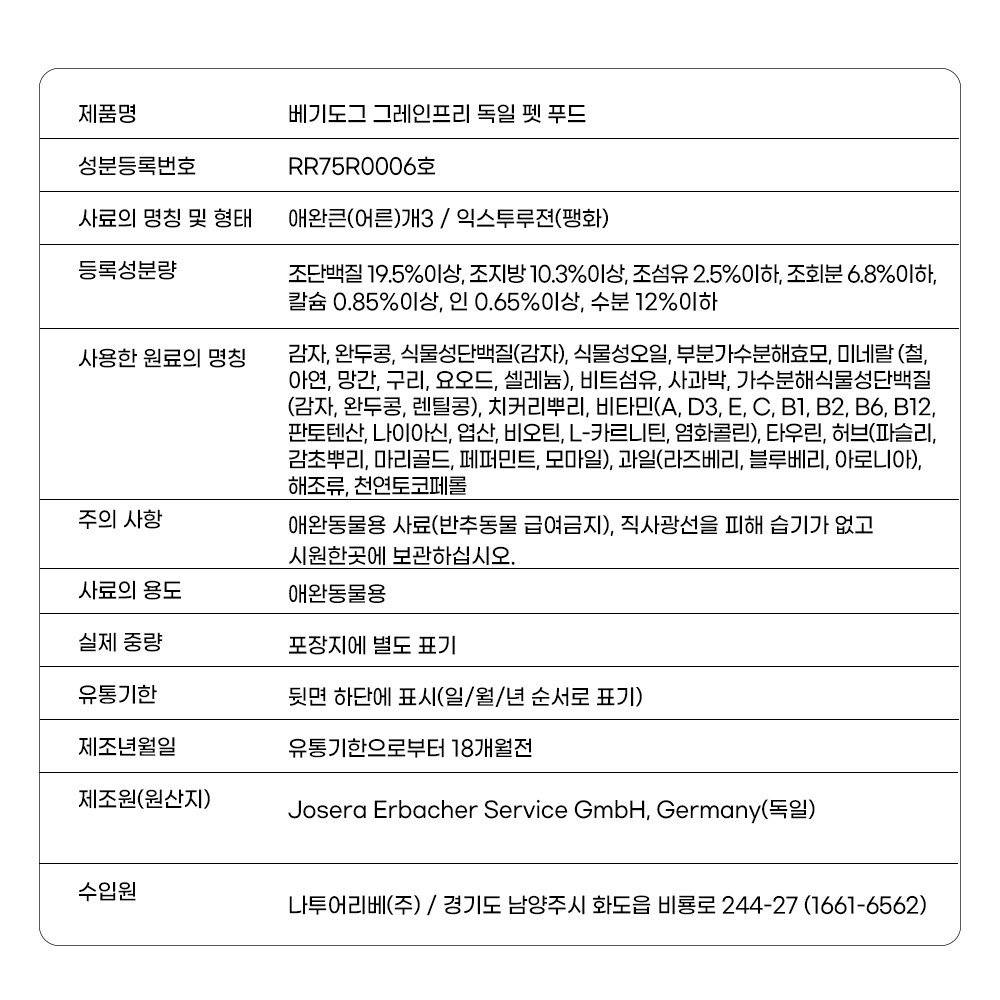 | 품명 및 모델명 | 베기도그 그레인프리 | 인증/허가 사항 | 사료관리법에 따른 성분등록번호 : 컨텐츠 참조 |