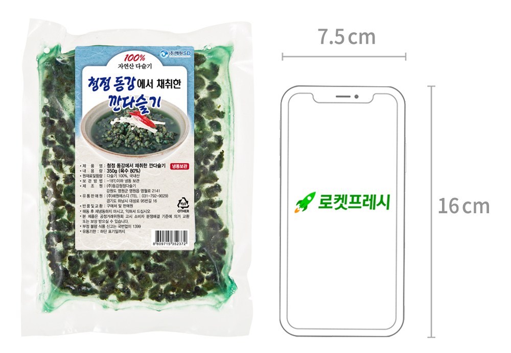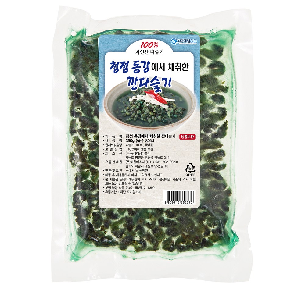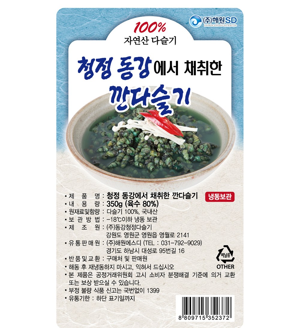 | 품목 또는 명칭 | 청정 동강에서 채취한 깐다슬기 | 포장단위별 내용물의 용량(중량),수량,크기 | 350g x 3개,1개 |
