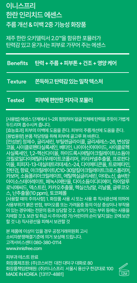 | 화장품제조업자, 화장품책임판매업자 및 맞춤형화장품판매업자 | (주)코스비전 / (주)이니스프리 | 제조국 | 한국 |