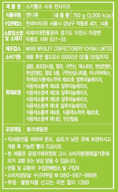 | 제품명 | 스키틀즈 샤워 펀사이즈 | 식품의 유형 | 컨텐츠 참조 |