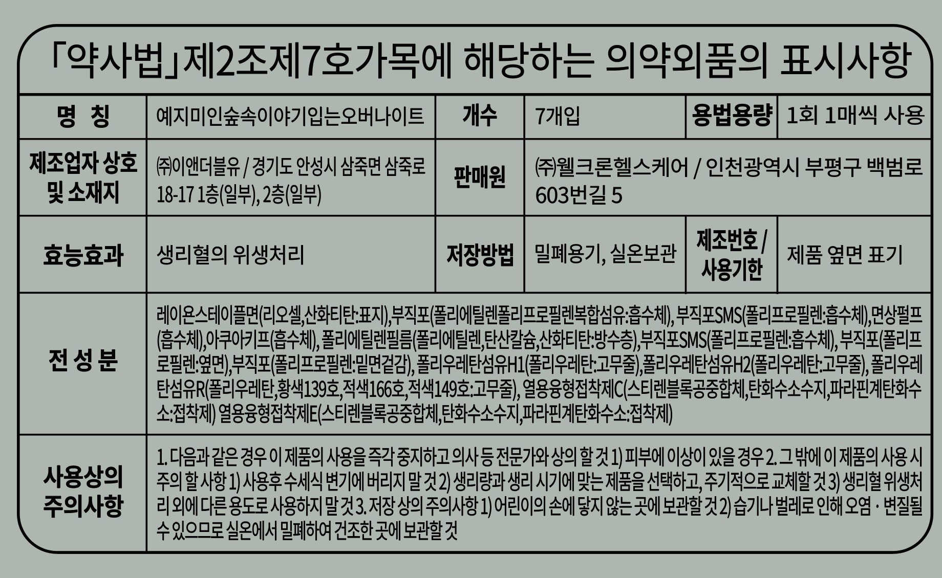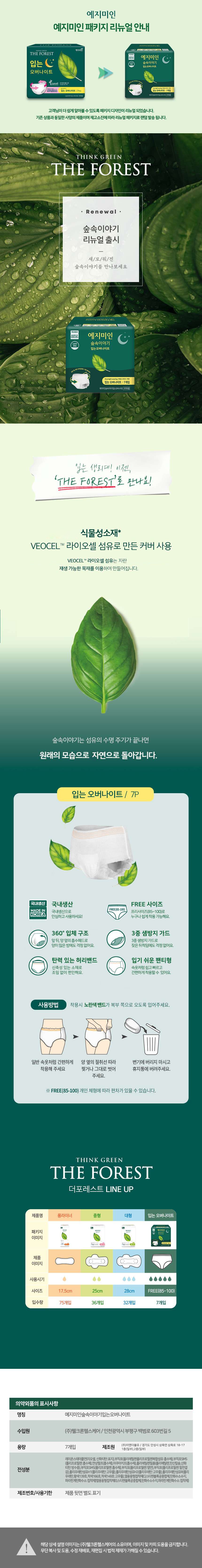 | 품명 및 모델명 | 뉴숲속이야기 입는 오버나이트 | 인증/허가 사항 | 의약외품 |