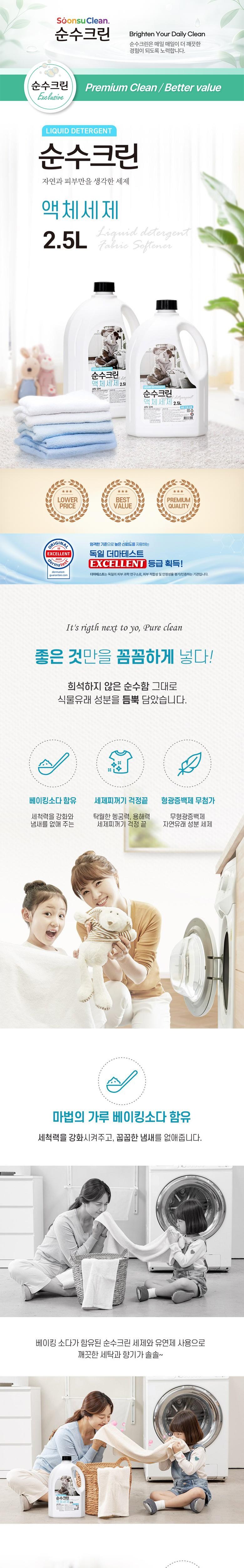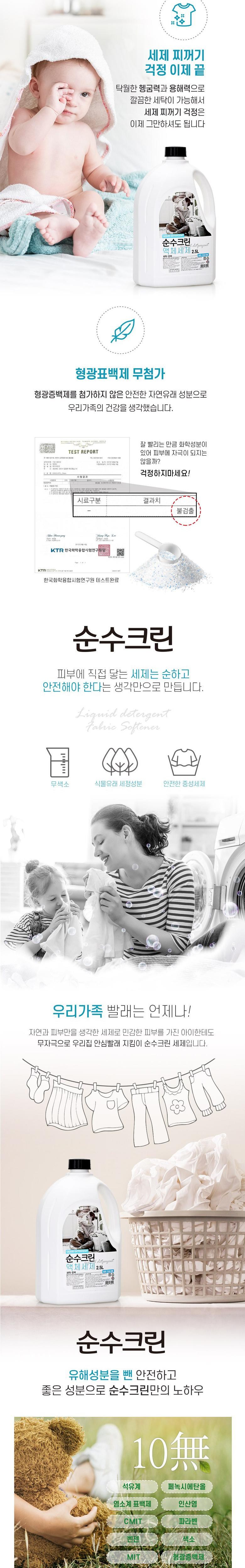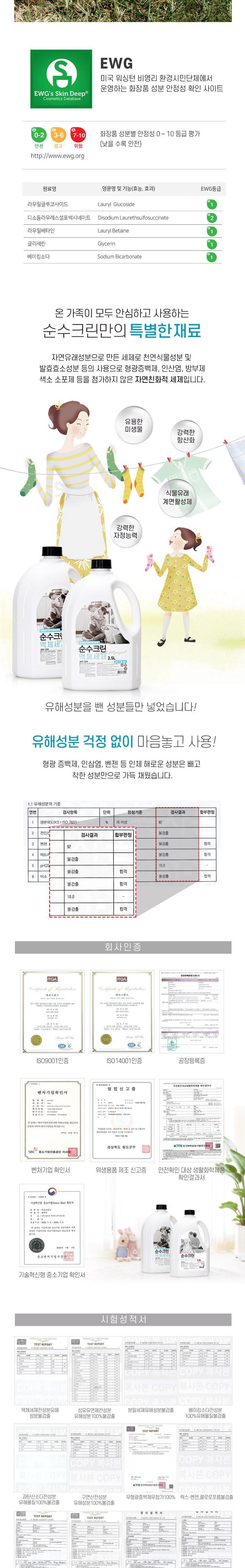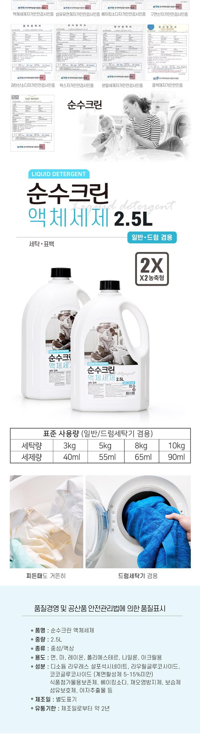 | 품목 및 제품명 | 순수크린 액체세제 | 용도(표백제의 경우 계열을 함께표시) 및 제형 | 세정제 |