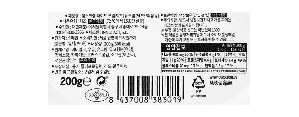 | 제품명 | 퀘스크렘 라이트 크림치즈 | 식품의 유형 | 컨텐츠참조 |