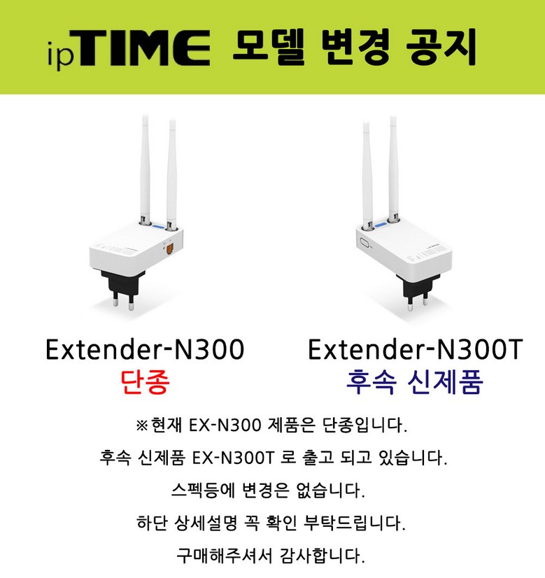 | 품명 및 모델명 | 아이피타임 Extender N300T | 인증/허가 사항 | R-R-EFM-EXN300T |