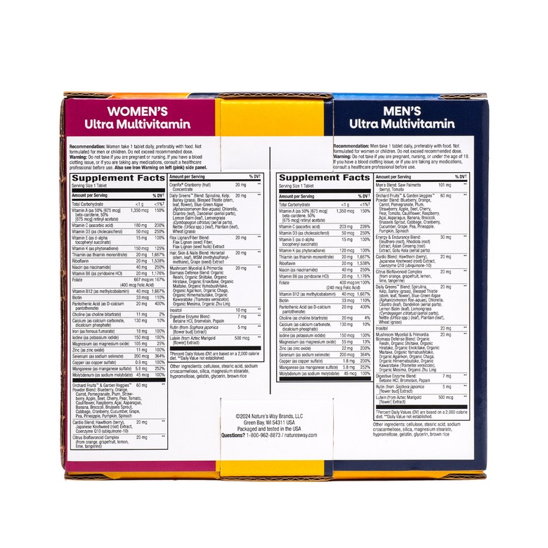 남성, 여성용 멀티비타민이 하나의 패키지에 담겨있는 세트 상품입니다. 건강에 필요한 비타민, 미네랄, 베타카로틴, 셀레늄 등이 함유되어 있습니다.
