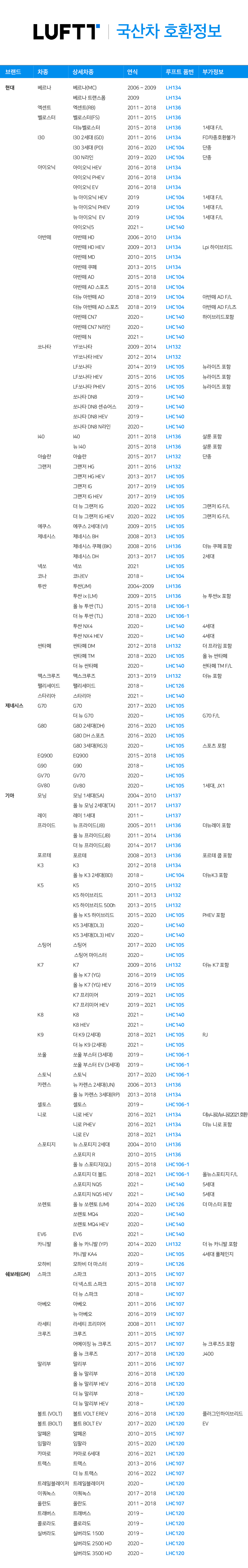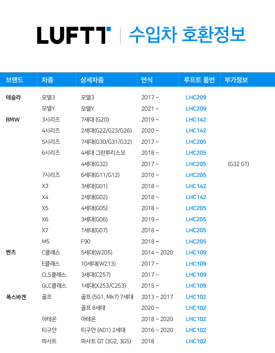 | KC 인증정보(자동차관리법에 따른 자기인증 대상 자동차부품에 한함) | 해당없음 | 제조자(수입자) | 주식회사 루프트코리아 |