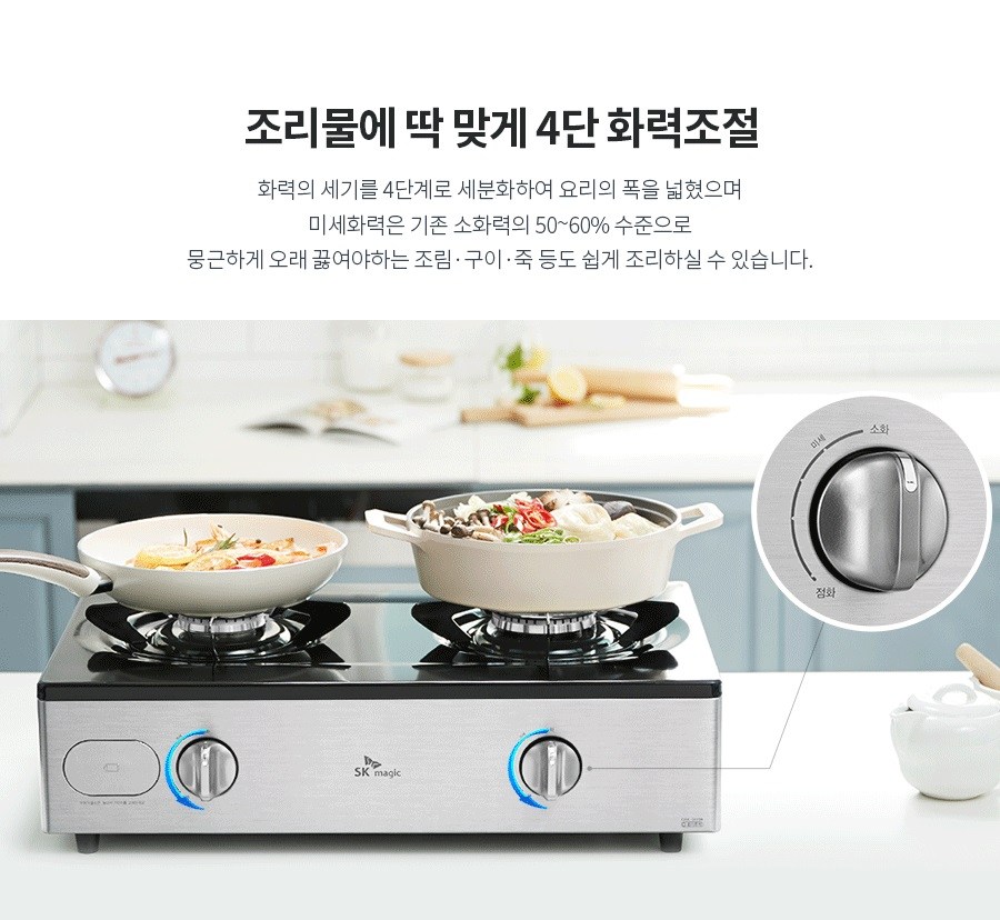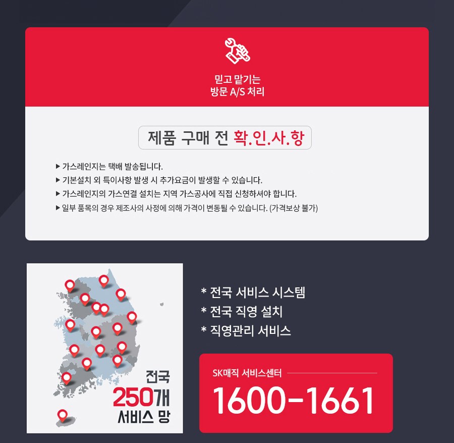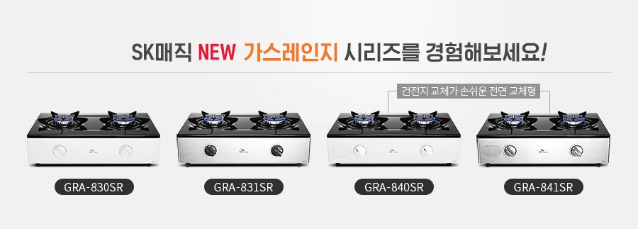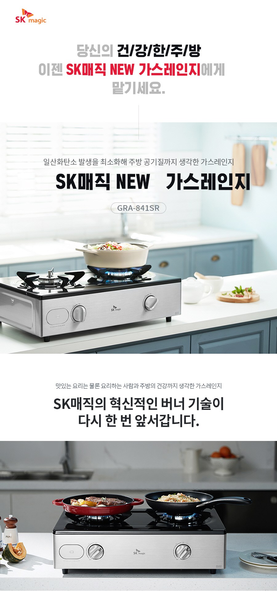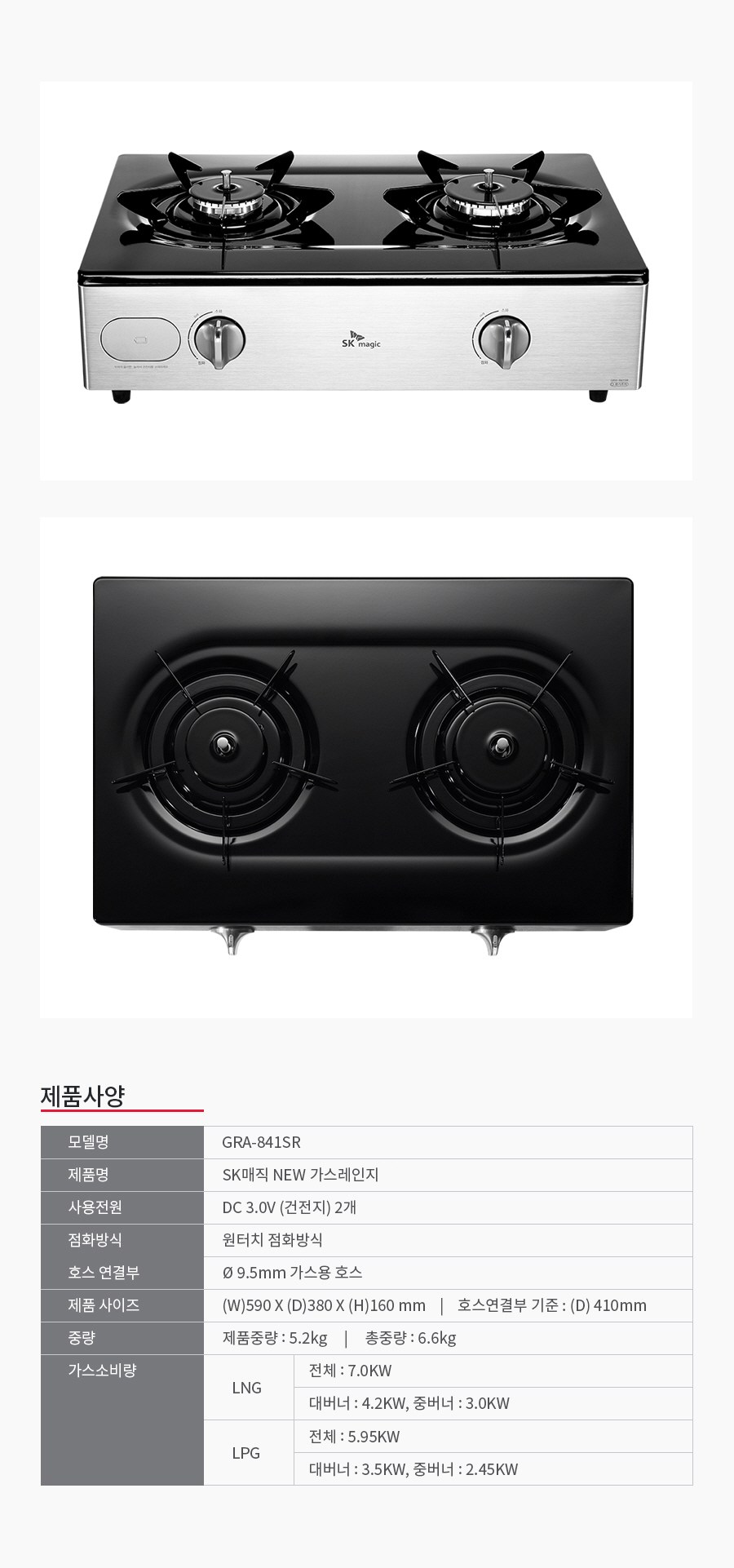 | 품명 및 모델명 | SK매직 NEW 전면배터리 2구 가스레인지 / GRA841SR(LPG) | KC 인증정보 | 표준번호: KS B 8114 / 인증번호: 제7307호, 전지: B052R949-1002A |