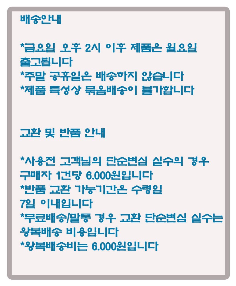 - ㆍ모니터 해상도의 차이로 인해 색상이나 이미지가 실제와 달라, 고객이 단순 변심으로 교환/반품을 무료로 요청하는 경우