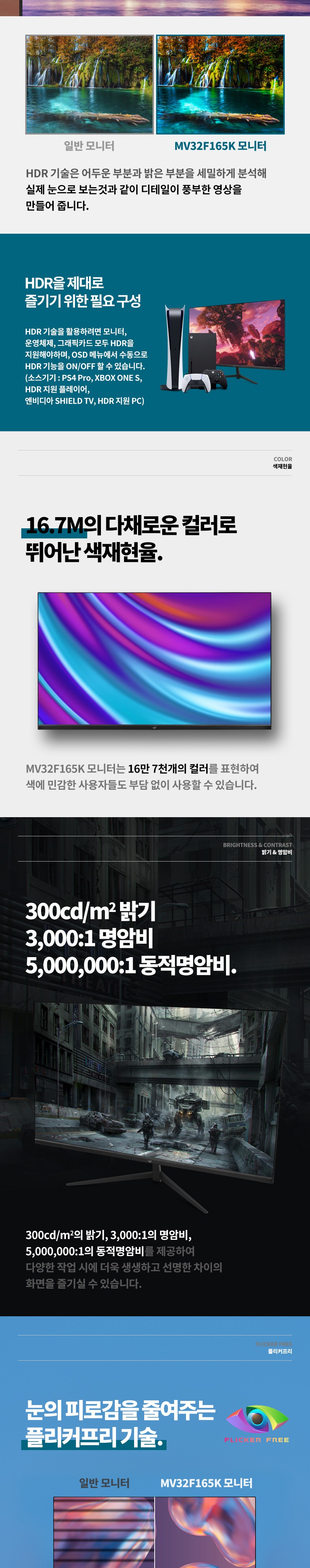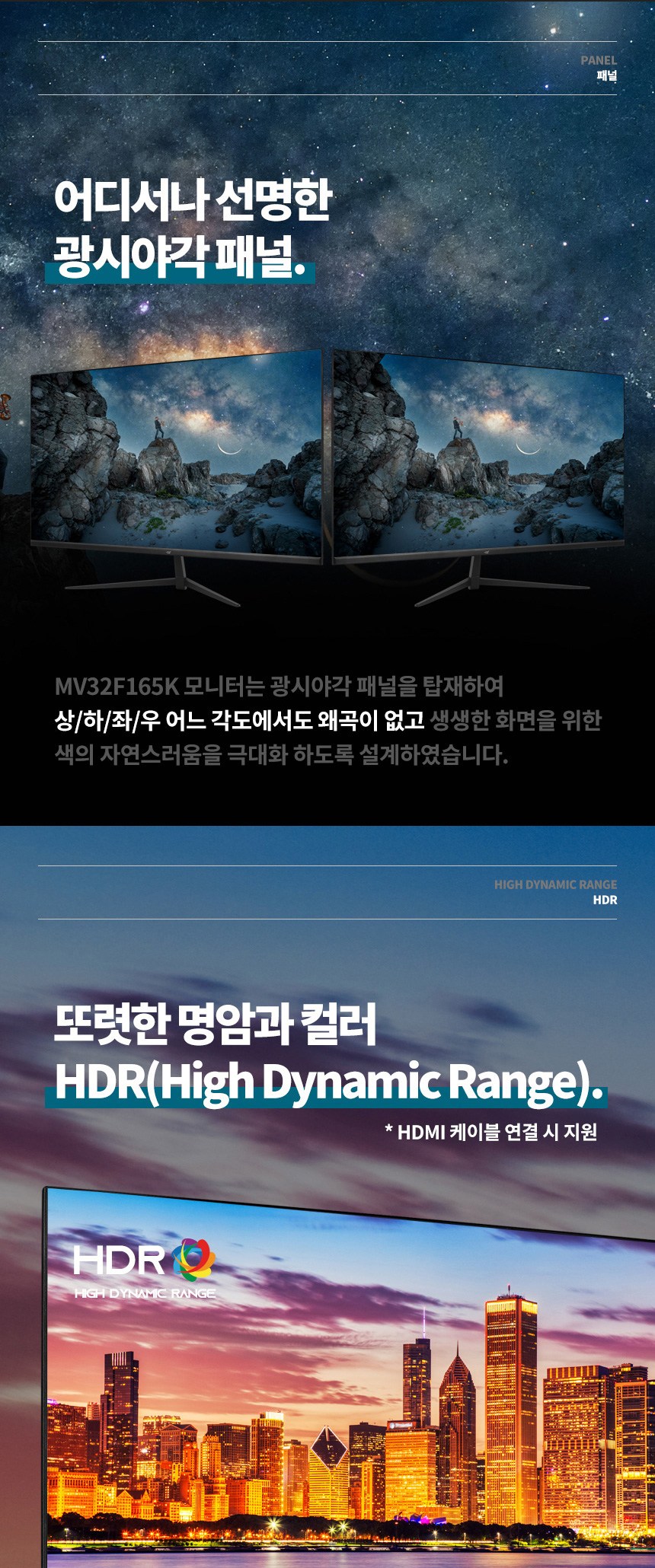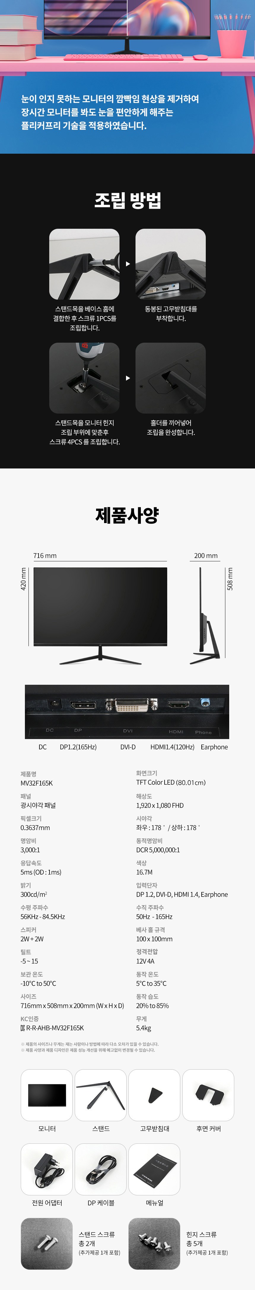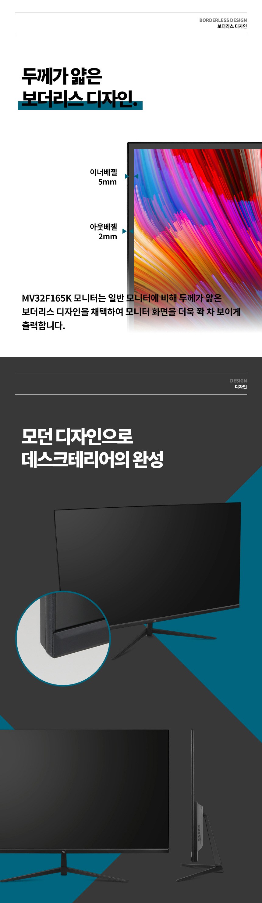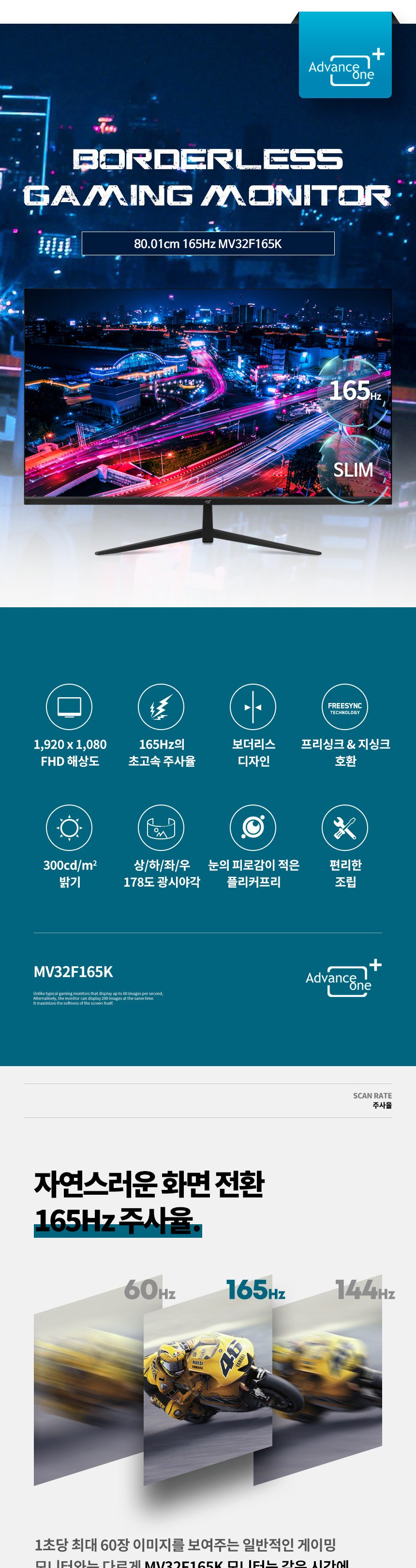 | 품명 및 모델명 | 어드밴스원 80.01cm FHD 리얼 보더리스 165hz 게이밍모니터 002 / MV32F165K 무결점 | KC 인증정보 | 본품: R-R-AHB-MV32F165K / 어댑터: HU10958-18005B, R-REM-RWX-R481-1204000DK |