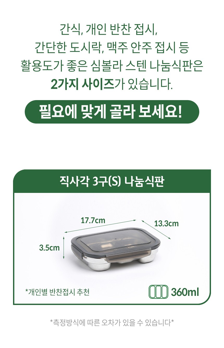 | 품명 및 모델명 | 심볼라 프레쉬락 스텐 밀폐용기 나눔식판 직사각 3구 S | 재질 | 컨텐츠 참조 |