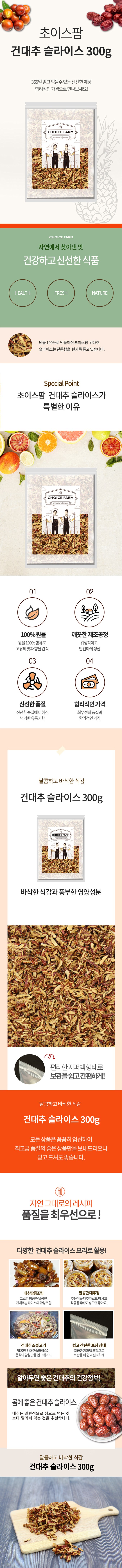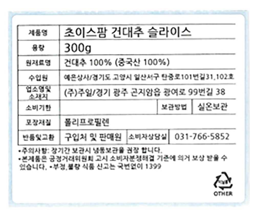 | 품목 또는 명칭 | 초이스팜 건대추 슬라이스 | 포장단위별 내용물의 용량(중량),수량,크기 | x 4개,1개 |