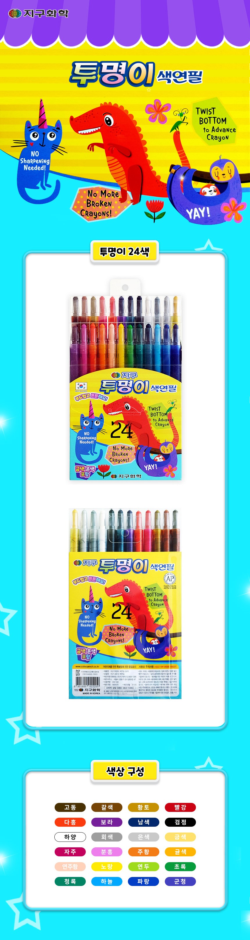 | 품명 및 모델명 | 지구화학 투명이 색연필 1개 24색 | KC 인증정보 | CB117A005-2002 |