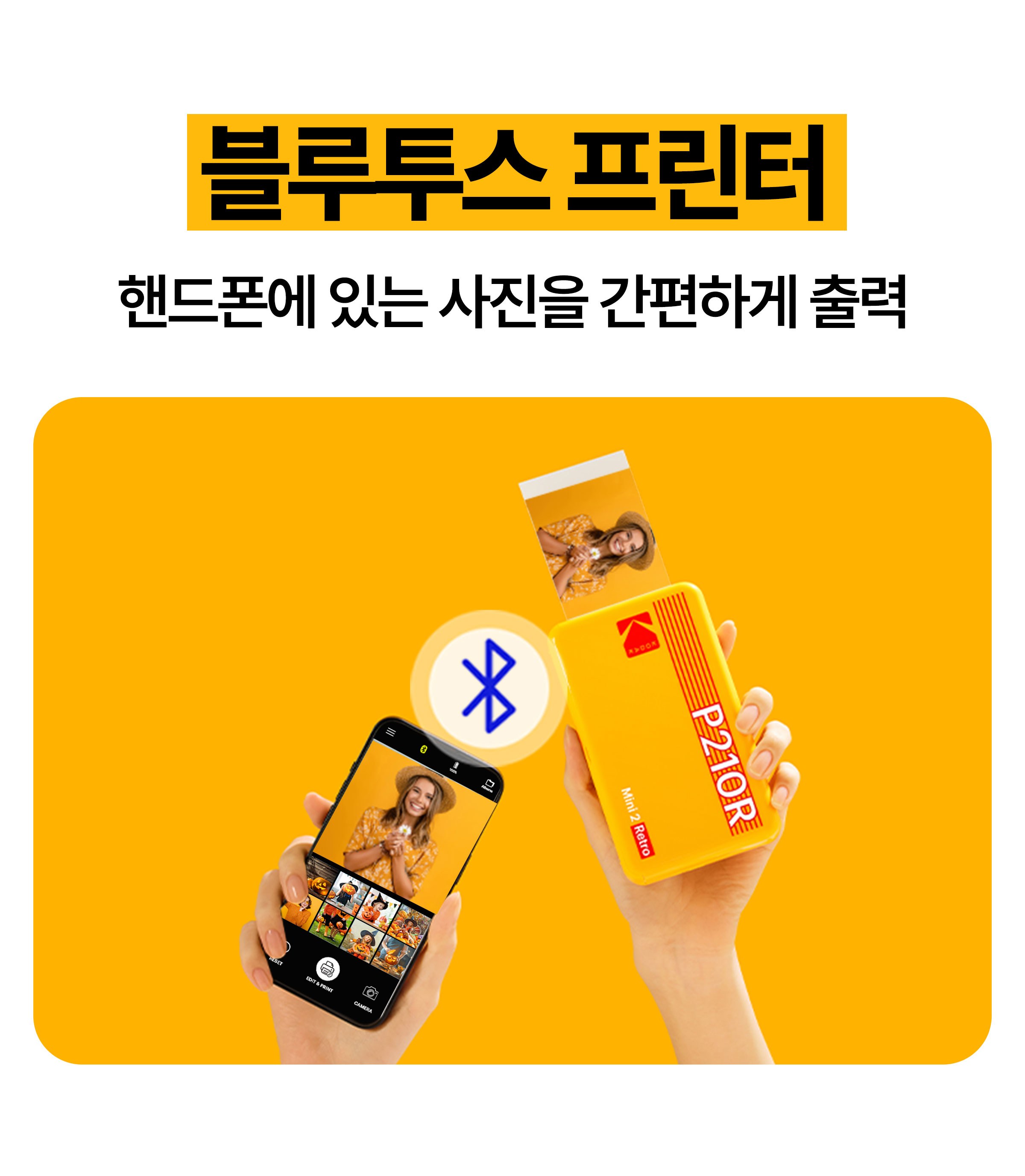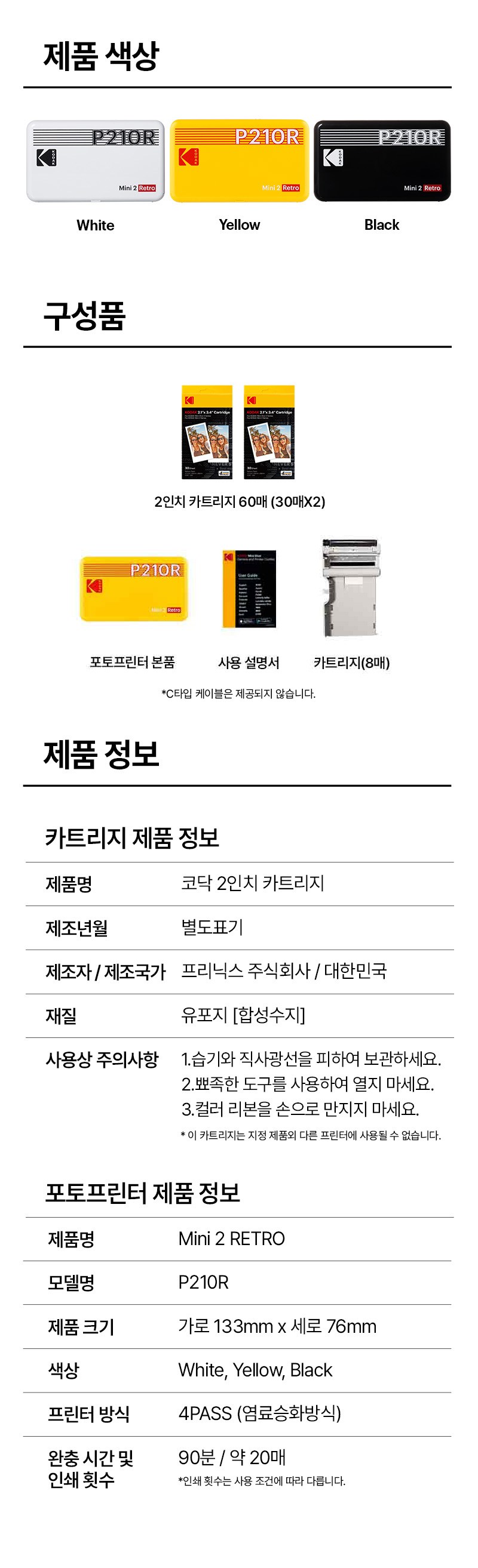 | 품명 및 모델명 | 코닥 미니 2 레트로 휴대용 포토프린터 P210 + 카트리지 | KC 인증정보 | 본품 : R-R-DPP-009046 / 전지 : YU10251-18011 |