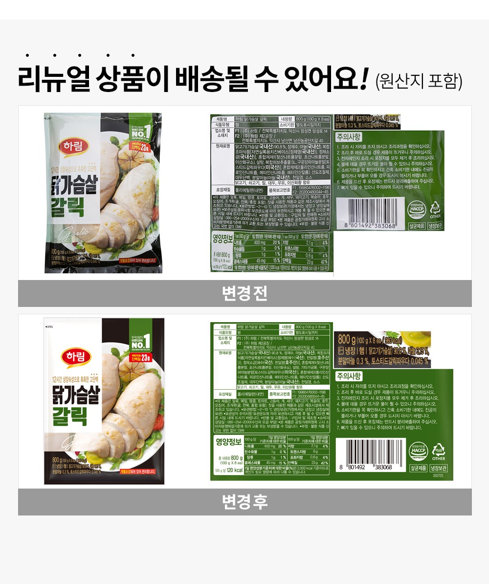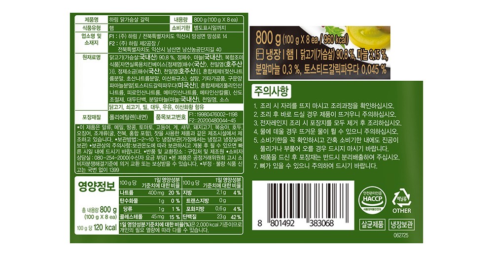 | 제품명 | 하림 닭가슴살 갈릭 | 식품의 유형 | 컨텐츠 참조 |
