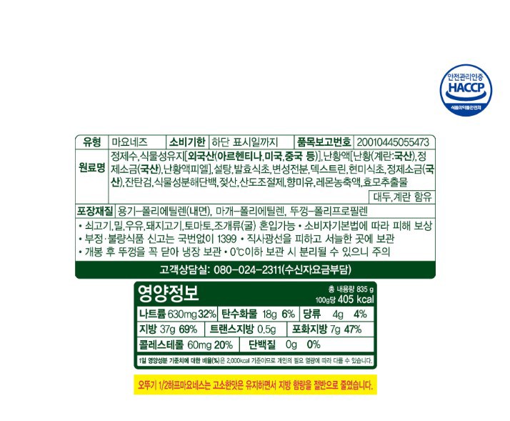 | 제품명 | 1/2 하프마요네스 | 식품의 유형 | 컨텐츠 참조 |