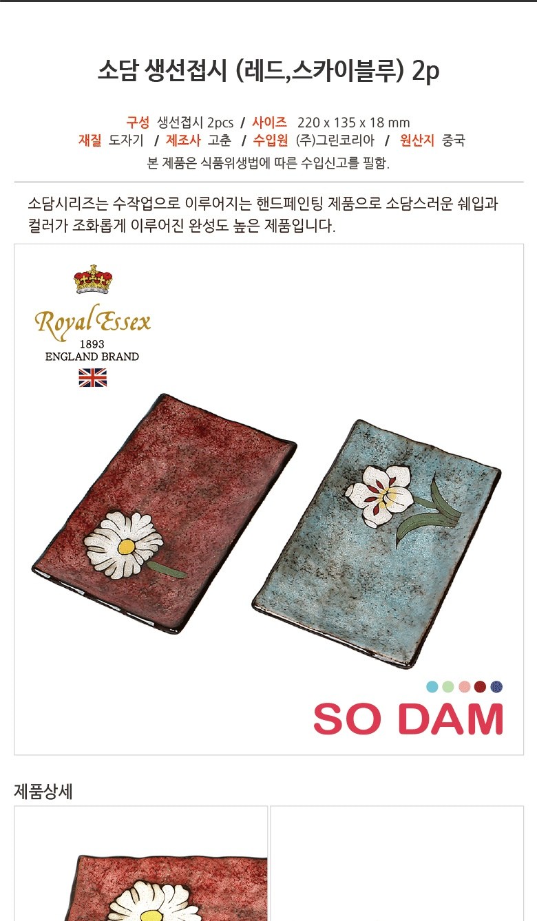 | 구성품 | 소담 생선접시(레드,스카이블루) 2p | 크기 | 220 x 135 x 18 mm |