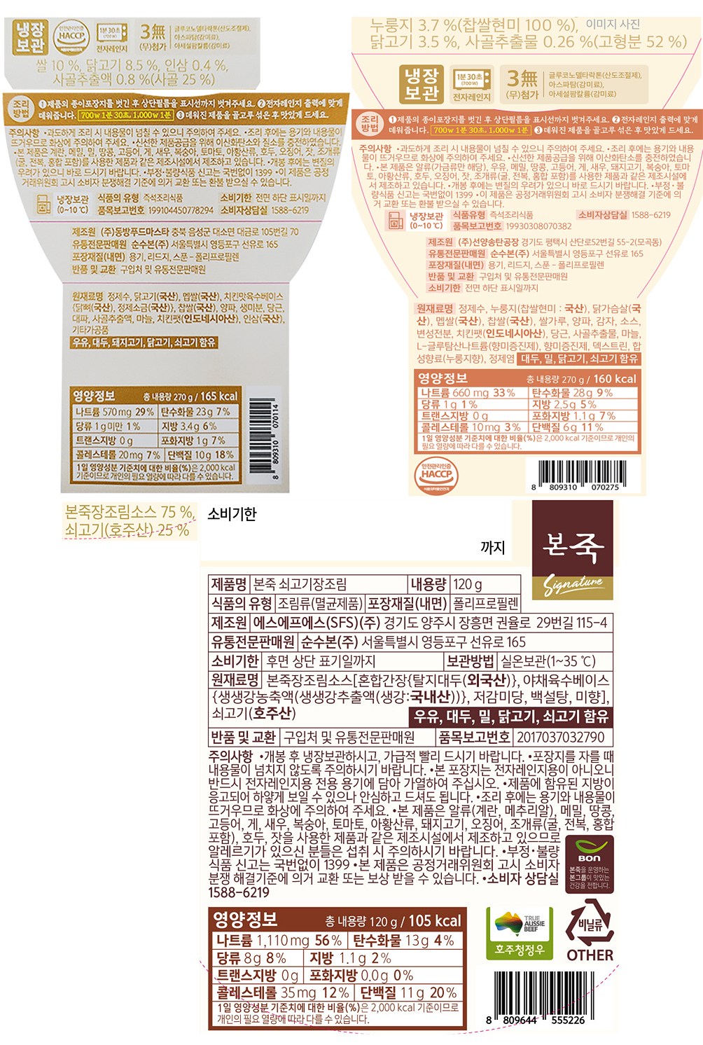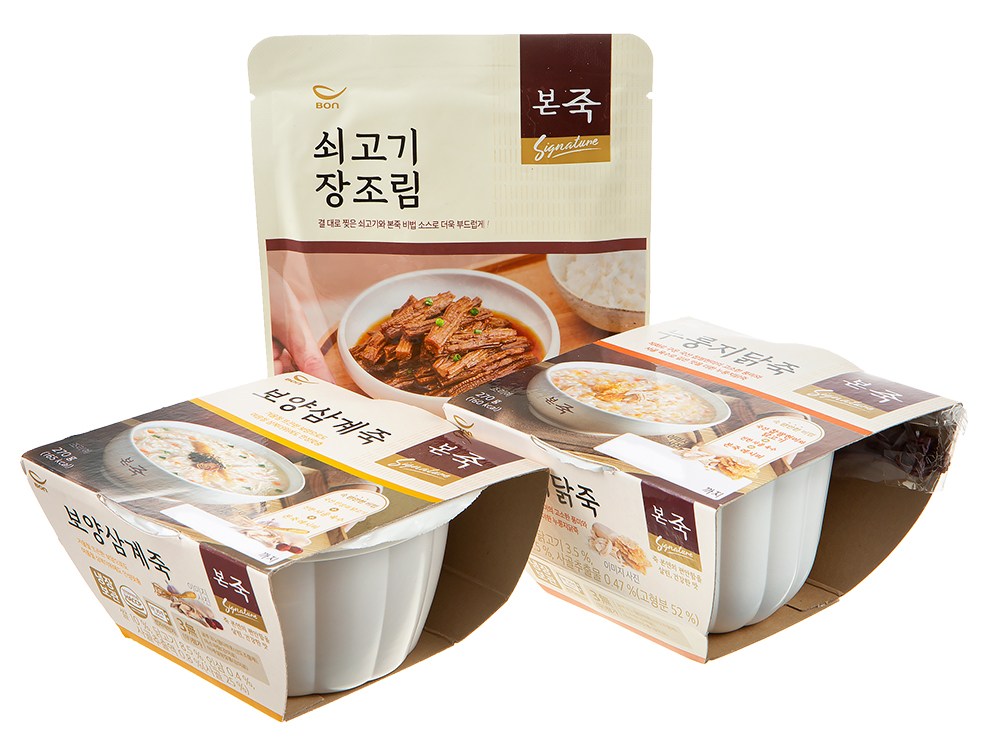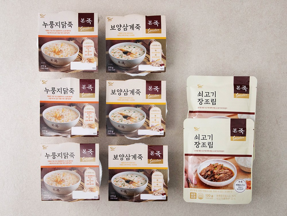 | 제품명 | 보양삼계죽(270g) + 누룽지닭죽(270g) + 본죽 쇠고기장조림 | 식품의 유형 | 컨텐츠 참조 |