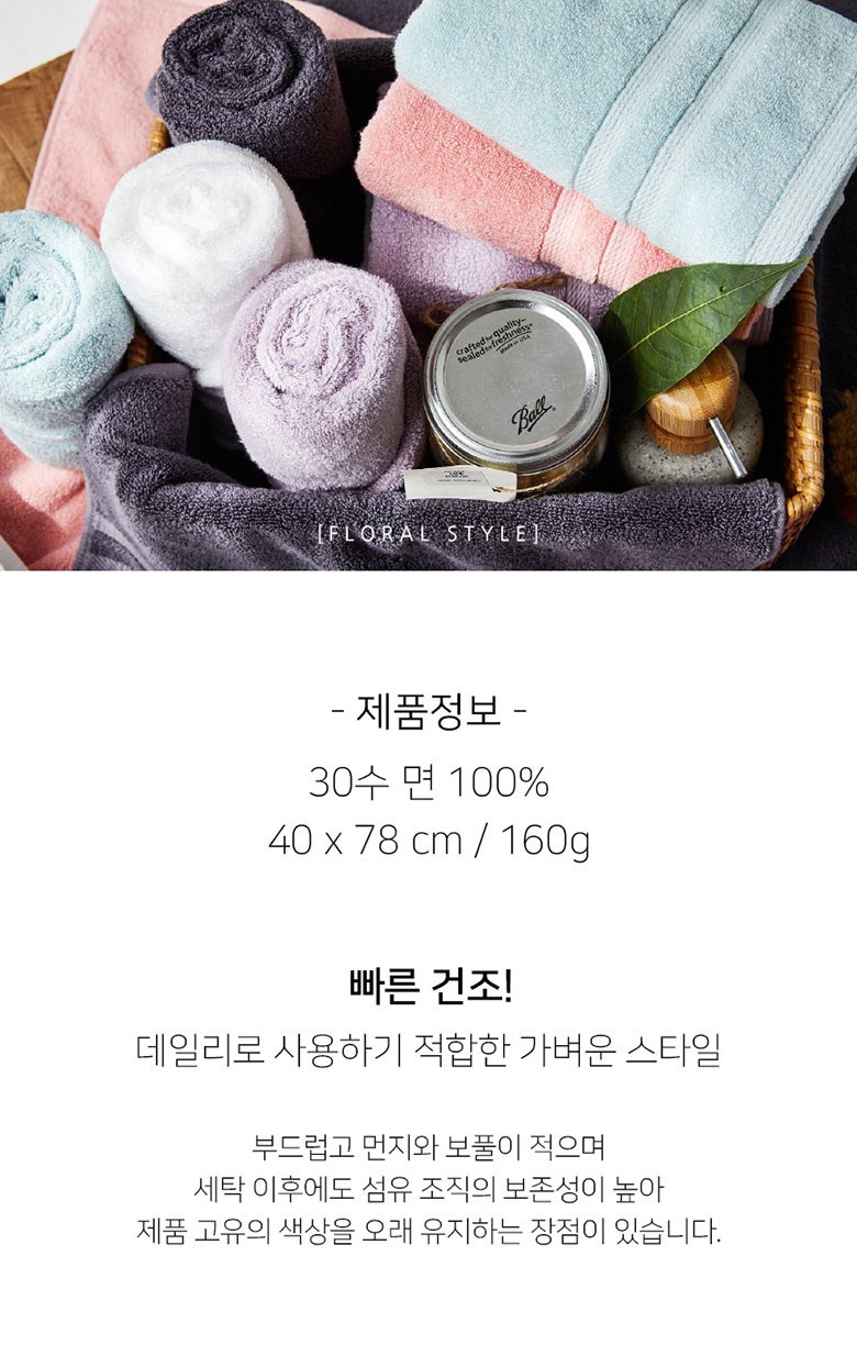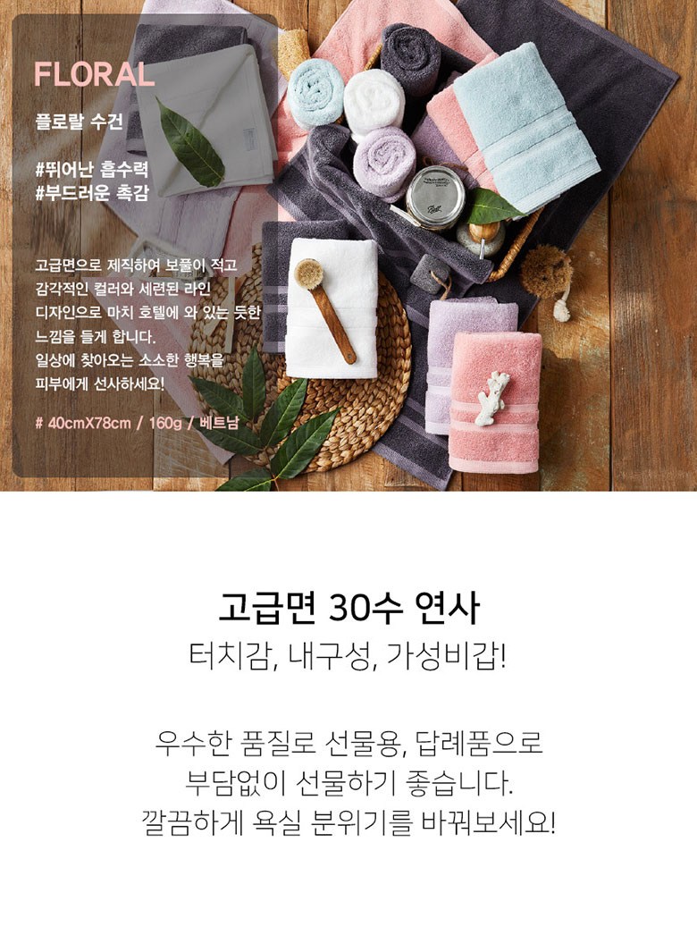 | 품명 및 모델명 | 소프트터치 플로랄 수건 160g 30수 면사 | 인증/허가 사항 | 해당없음 |