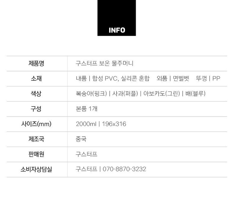 | 품명 및 모델명 | 구스터프 대형 푸르츠 보온 물주머니 커버 2L 세트, 애플 퍼플 | 인증/허가 사항 | 해당없음 |
