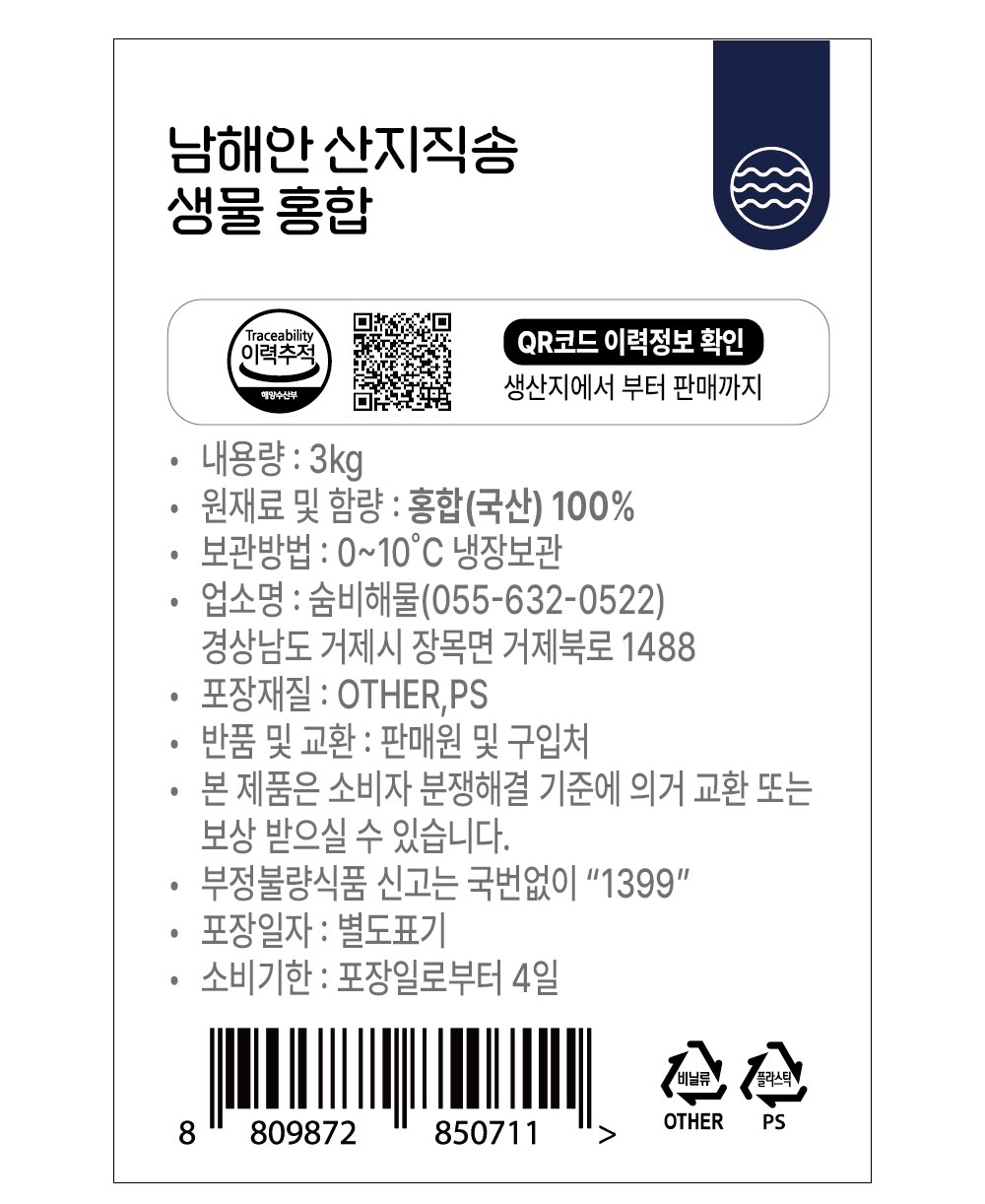 | 품목 또는 명칭 | 해안 산지직송 생물 홍합 | 포장단위별 내용물의 용량(중량),수량,크기 | 3kg x 2개,1개 |
