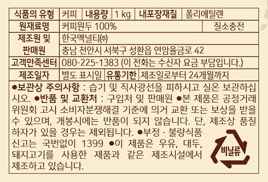 | 제품명 | 맥널티 에스프레소 블랙 원두커피 | 식품의 유형 | 컨텐츠 참조 |