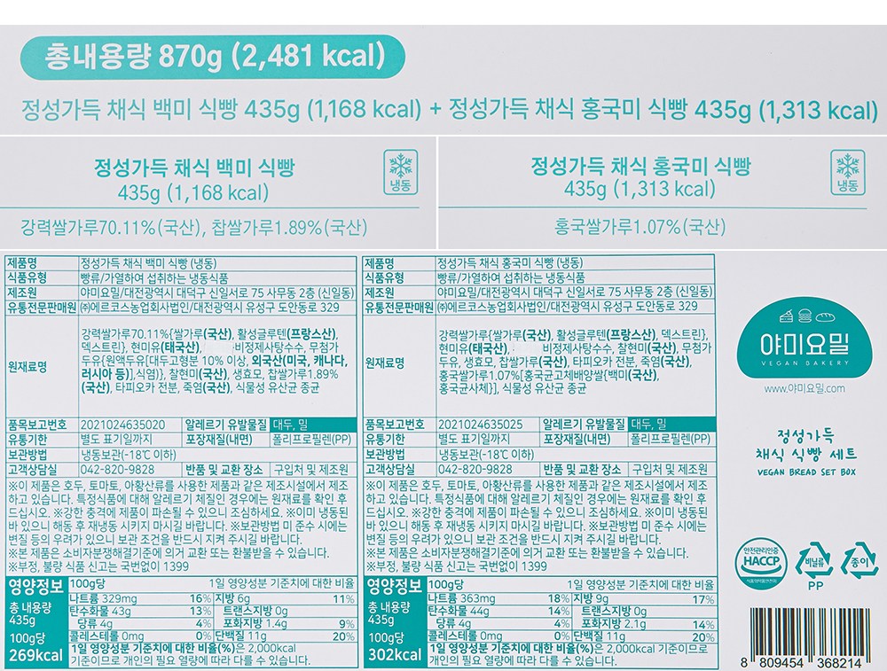| 포장단위별 내용물의 용량(중량), 수량 | 870g(백미 식빵 435g + 홍국미 식빵 435g), 1개 | 원재료명 및 함량 | 컨텐츠 참조 |