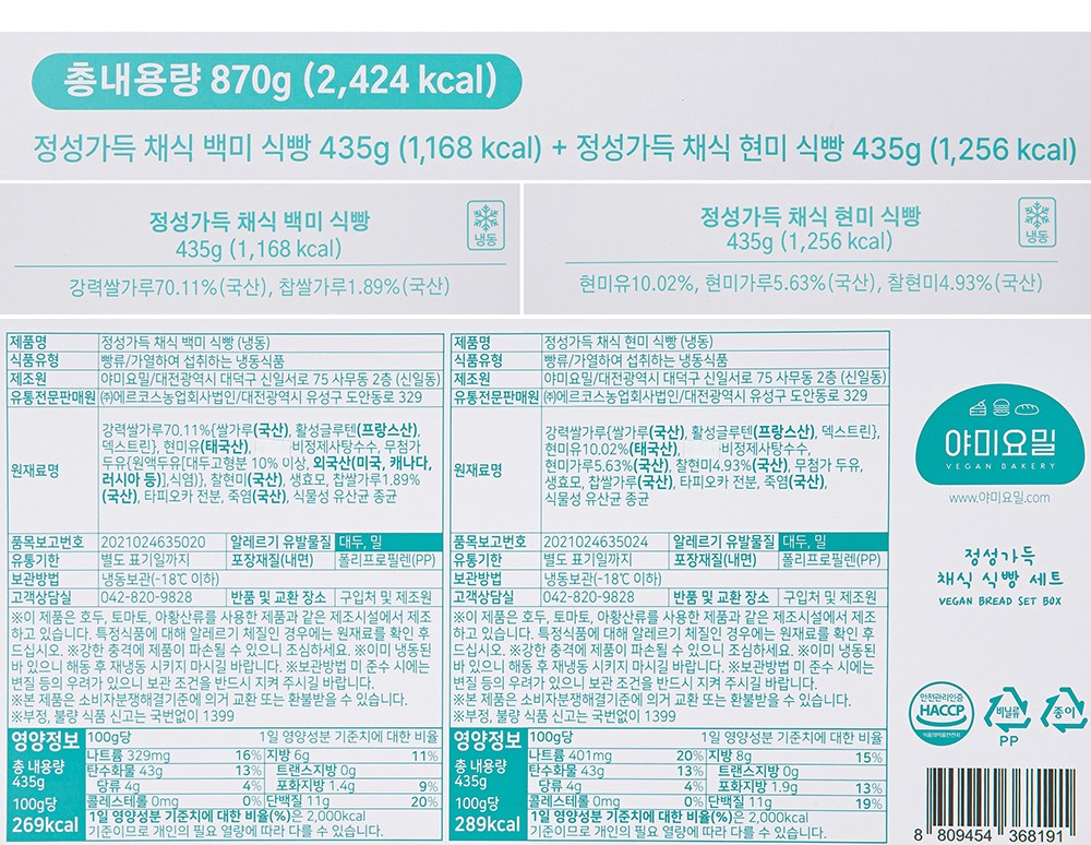 | 포장단위별 내용물의 용량(중량), 수량 | 870g(백미 식빵 435g + 현미 식빵 435g), 1개 | 원재료명 및 함량 | 컨텐츠 참조 |