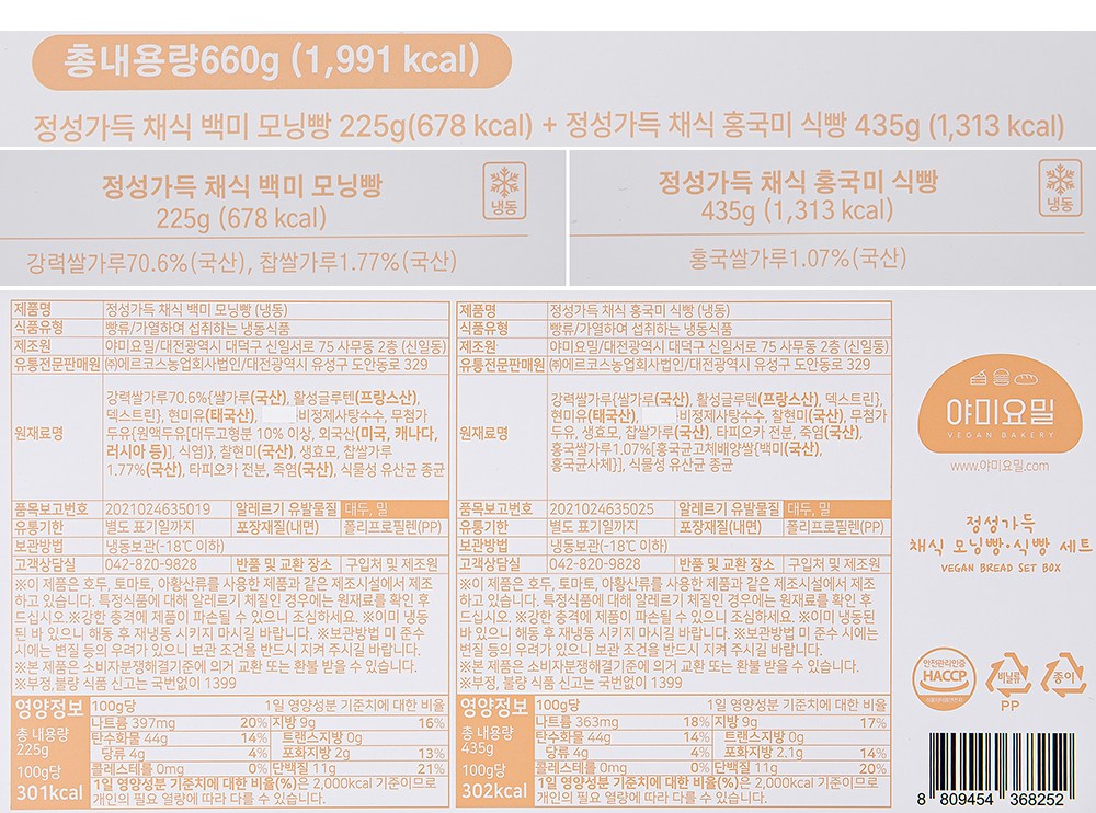 | 포장단위별 내용물의 용량(중량), 수량 | 660g(모닝빵 225g + 식빵 435g), 1개 | 원재료명 및 함량 | 컨텐츠 참조 |