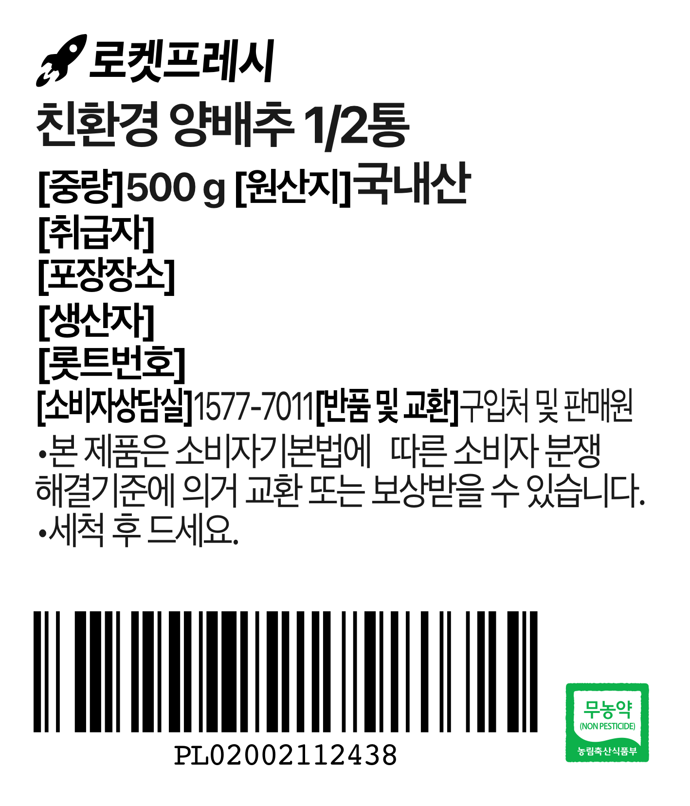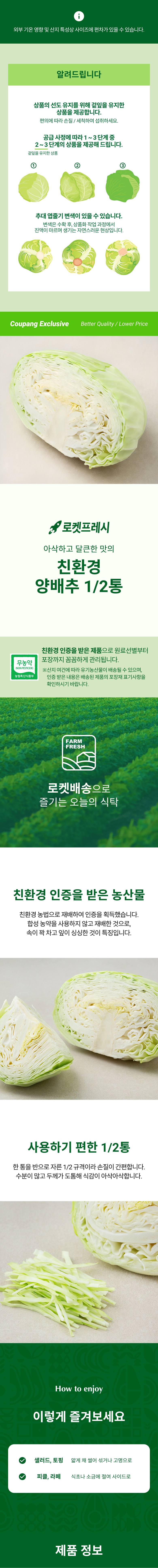 | 품목 또는 명칭 | 친환경 양배추 1/2통 | 포장단위별 내용물의 용량(중량),수량,크기 | 500gx4개 |