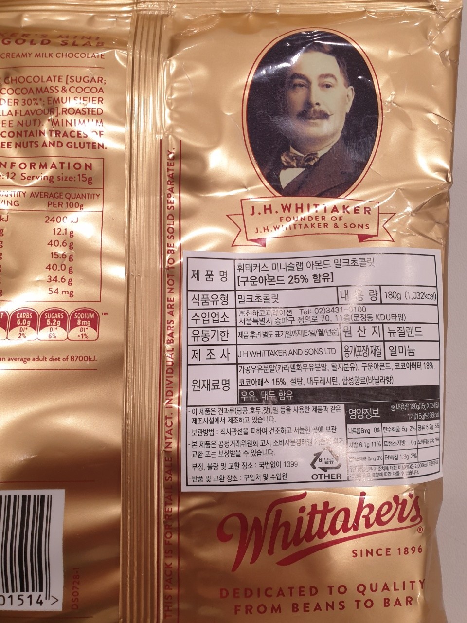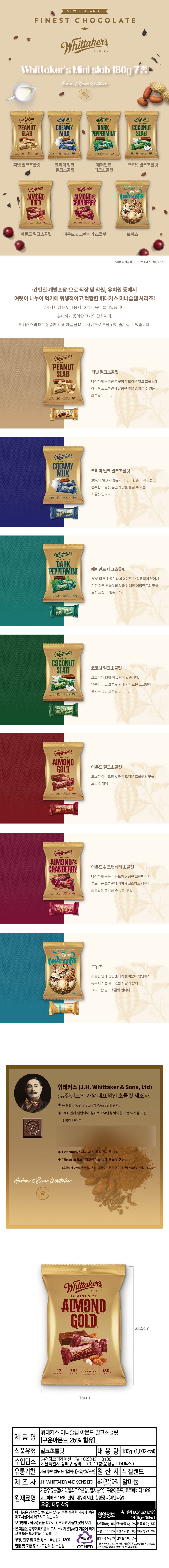 | 제품명 | 휘태커스 미니 슬랩 아몬드 밀크초콜릿 | 식품의 유형 | 컨텐츠 참조 |
