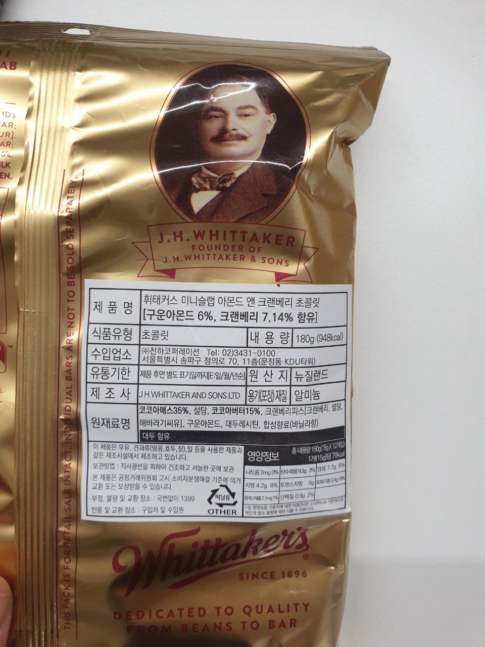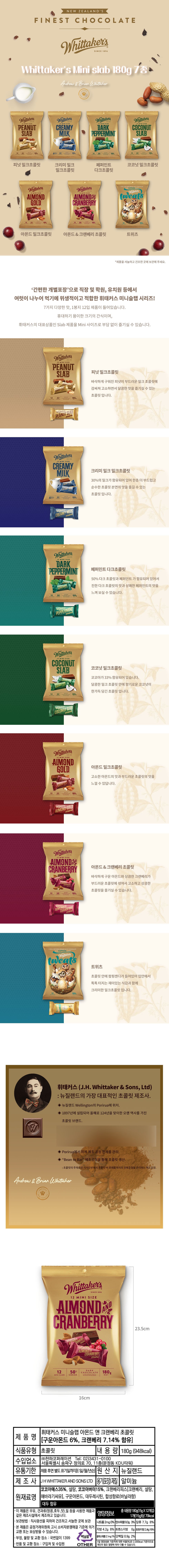 | 제품명 | 휘태커스 미니 슬랩 아몬드 앤 크랜베리 초콜릿 | 식품의 유형 | 컨텐츠 참조 |