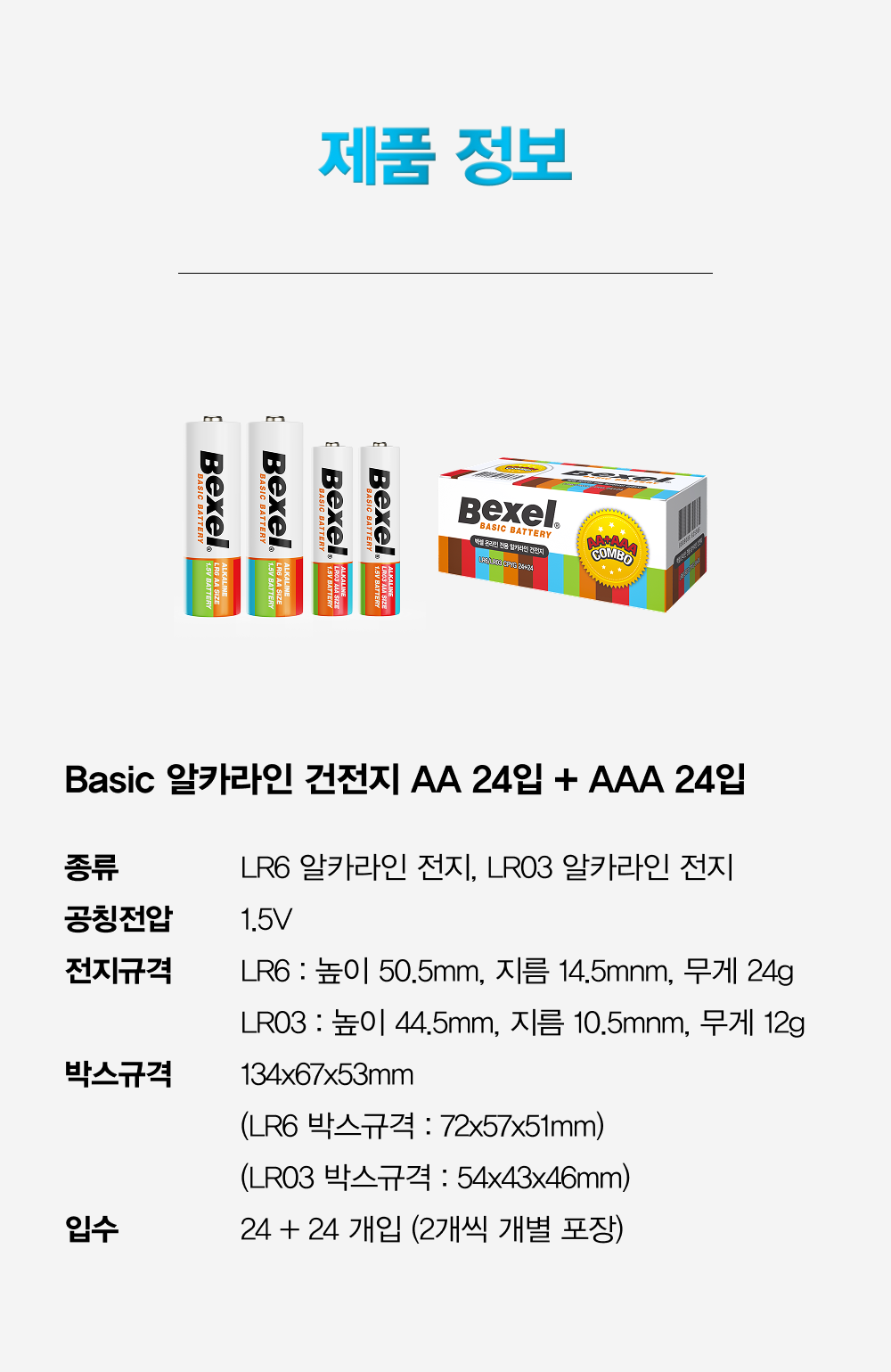| 품명 및 모델명 | 벡셀 알카라인 건전지 AA + AAA / BEXEL | 인증/허가 사항 | AA : B052R350-6002A, AAA : B052R350-6003A |