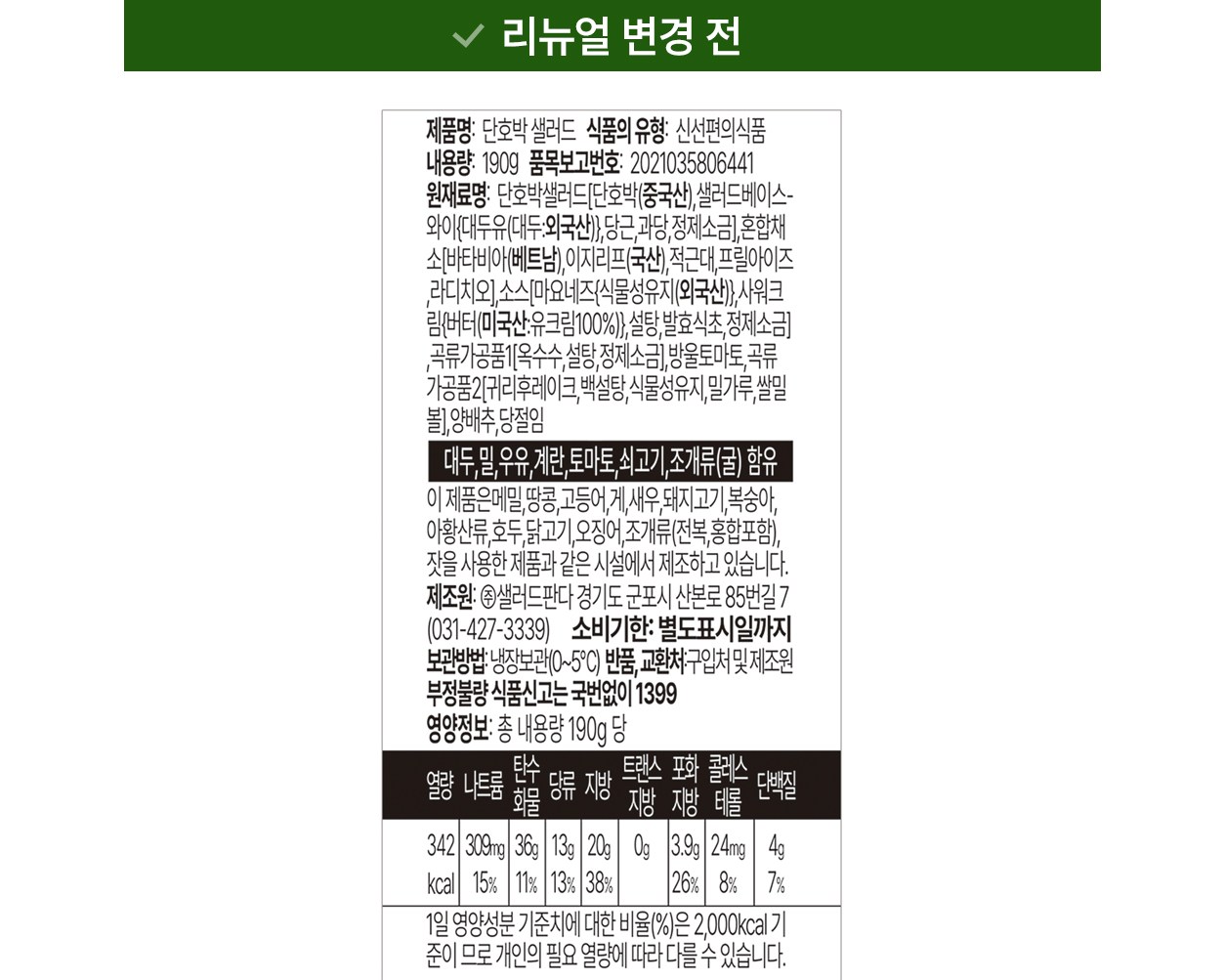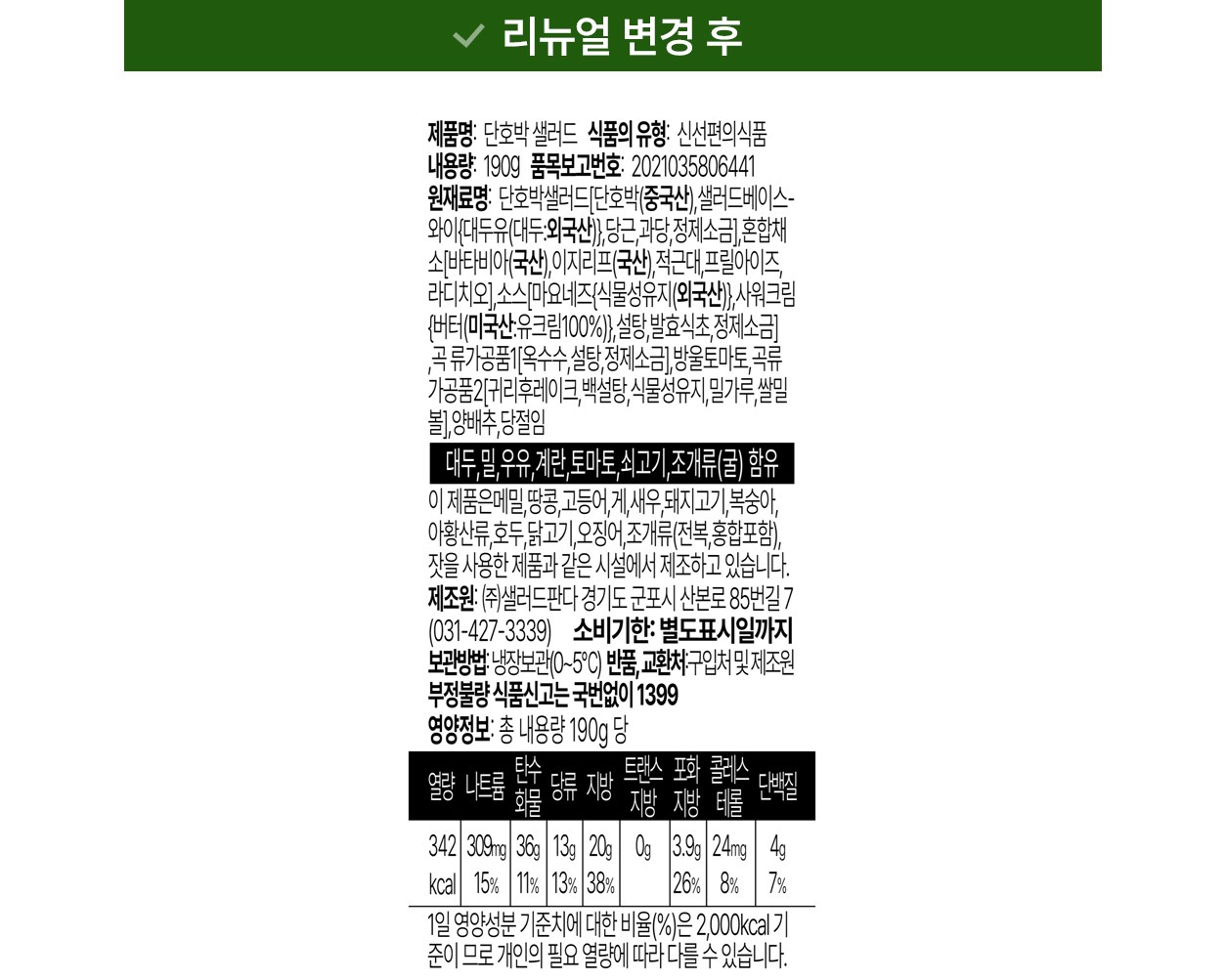 | 포장단위별 내용물의 용량(중량), 수량 | 190g x 2개 | 원재료명 및 함량 | 컨텐츠 참조 |