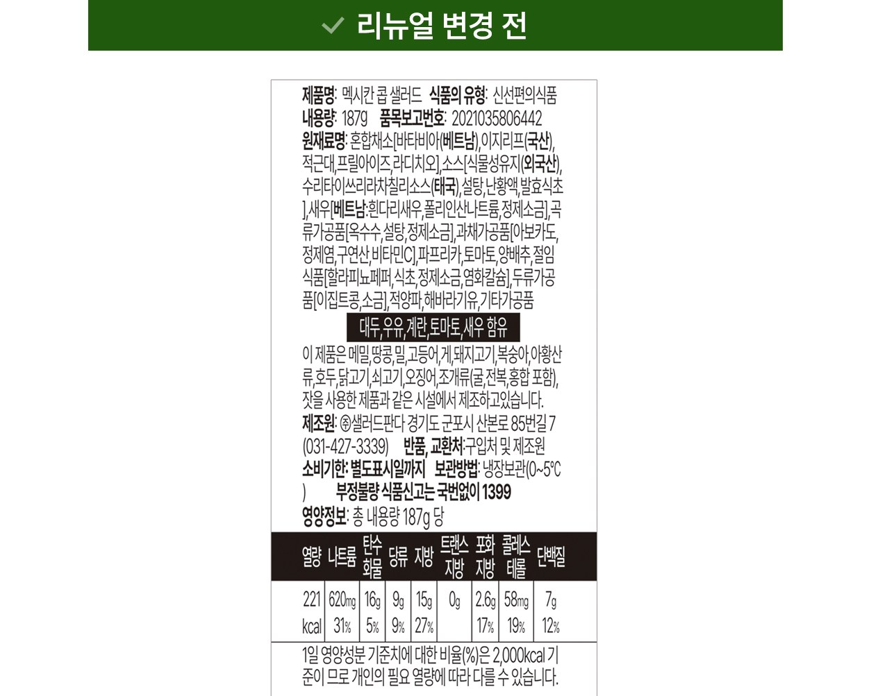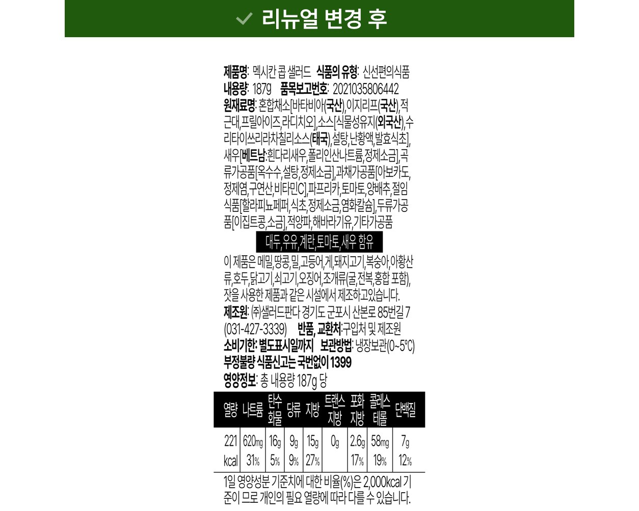 | 포장단위별 내용물의 용량(중량), 수량 | 187g x 2개 | 원재료명 및 함량 | 컨텐츠 참조 |