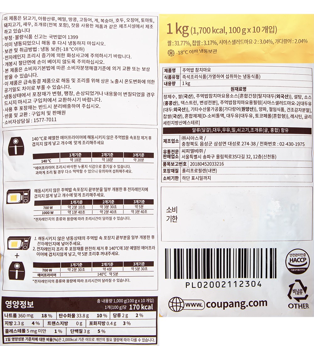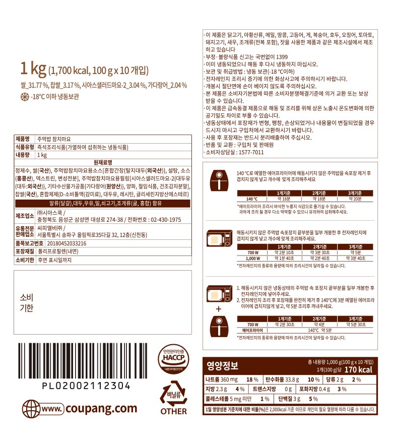 | 포장단위별 내용물의 용량(중량), 수량 | 100g*10개입, 1개 | 원재료명 및 함량 | 컨텐츠 참조 |